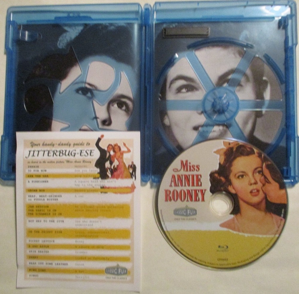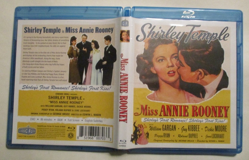 Very Good Film. Distributed by ClassicFlix which keeps production to a minimum. This is a fairly expensive blu ray now. Miss Annie Rooney stars Shirley Temple, William Gargan, Guy Kibbee, Dickie Moore, Peggy Ryan, Roland Dupree, and you get to see a young June Lockhart from Lost in Space. $4.25 media mail continental US only.