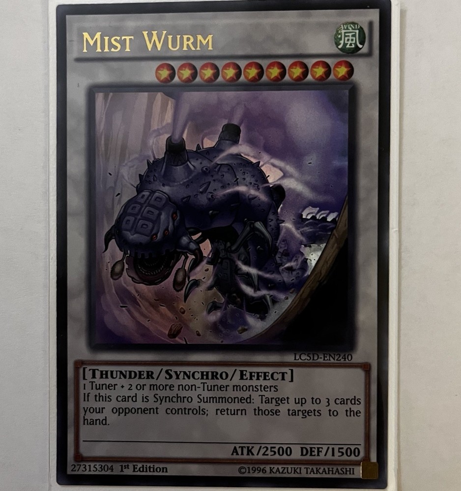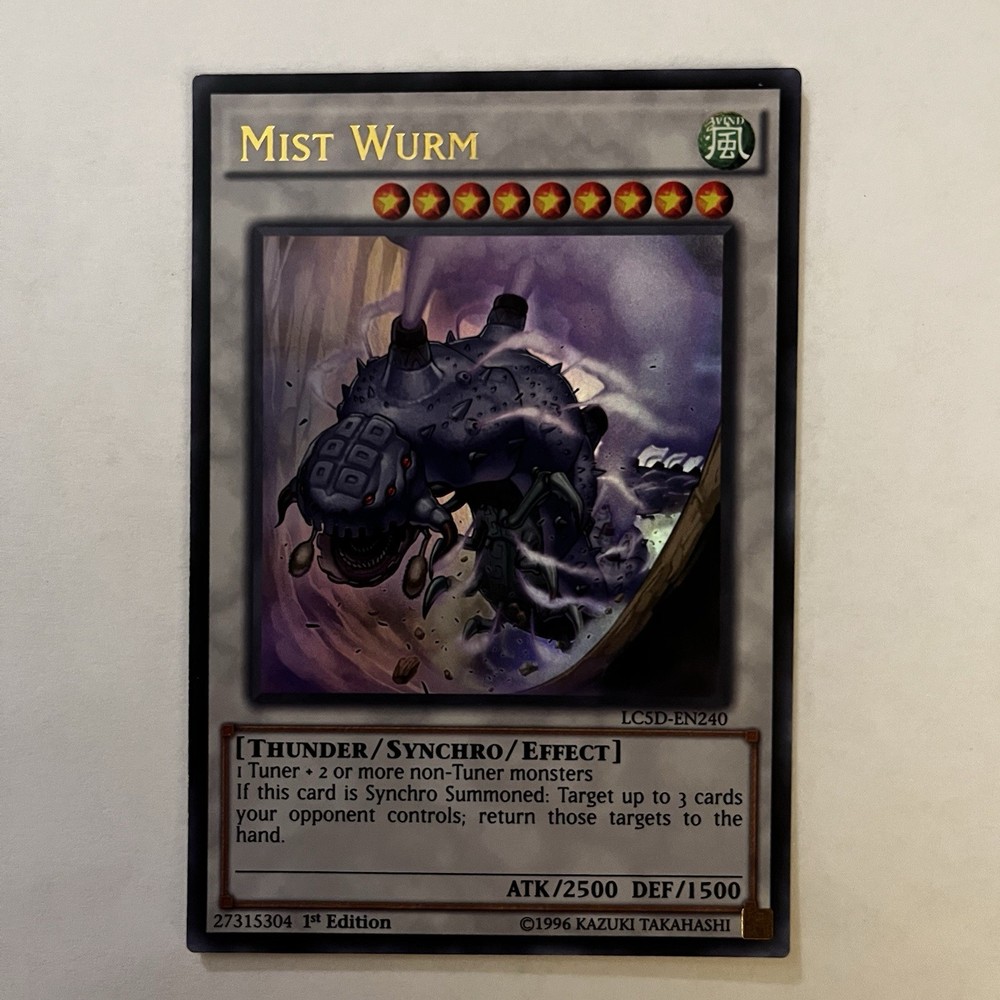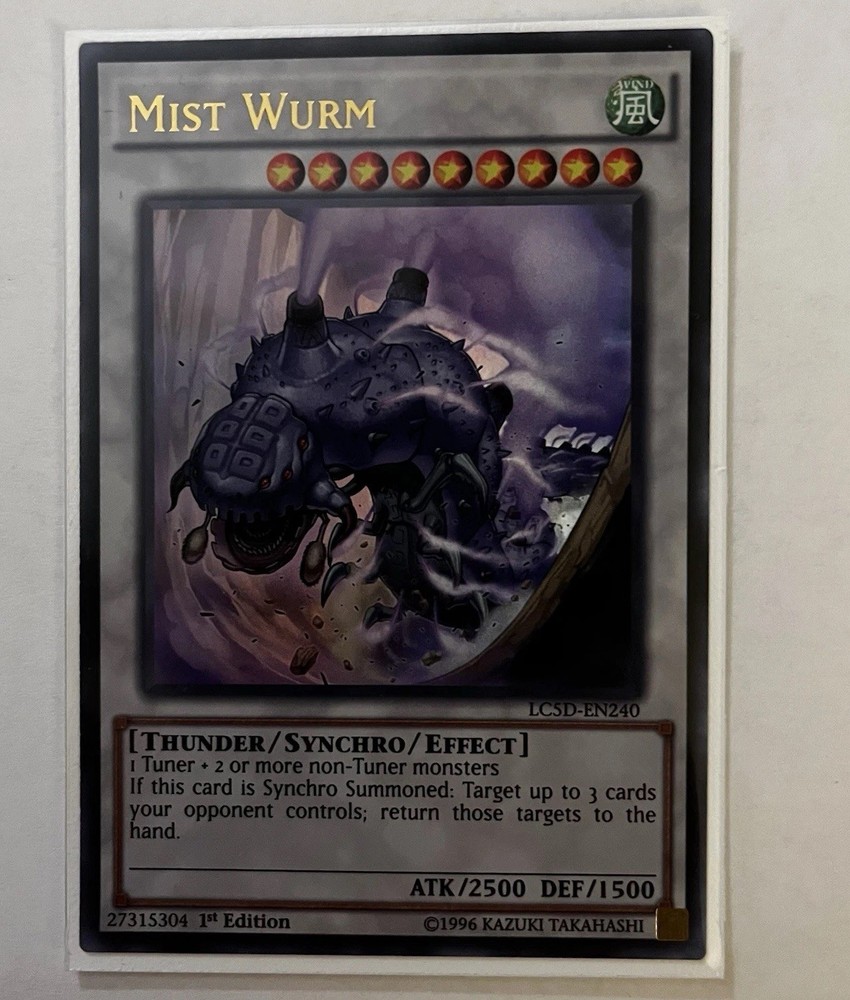 The Mist Wurm LC5D-EN240 is a highly sought-after card in the Yu-Gi-Oh! TCG. Being part of the Legendary Collection 5D's set, this 1st Edition card features a Wind attribute, Thunder Creature Type, and boasts impressive stats of 1500 Defense and 2500 Attack power. As an Ultra Rare collectible from Konami, this Synchro and Effect card is a valuable addition to any card collection for fans of the game. With its sought-after rarity and special edition status, the Mist Wurm card is a must-have for collectors and players alike.