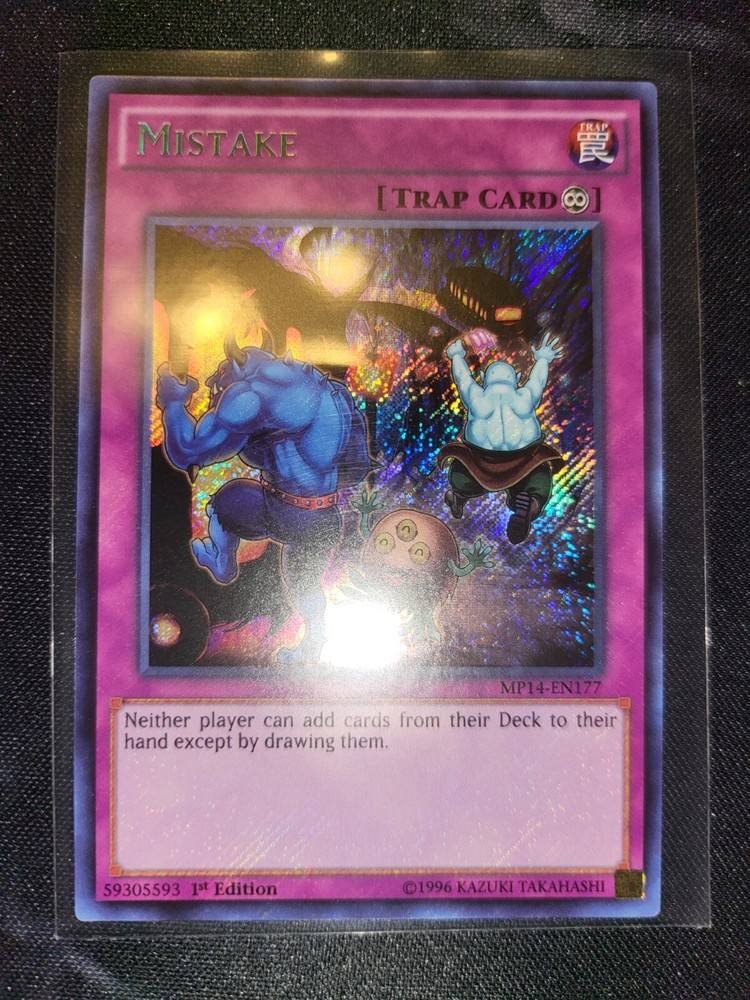 The Mistake MP14-EN177 card is a 2014 1st Edition Secret Rare Yu-Gi-Oh! TCG collectible from the Mega-Tins Mega Pack set. Manufactured by Konami, this Trap-Normal card has a defense/toughness of 0 and an attack/power of 0, making it a unique addition to any Yu-Gi-Oh! card collection. The English language card features intricate artwork and is a must-have for collectors and players of the popular trading card game.