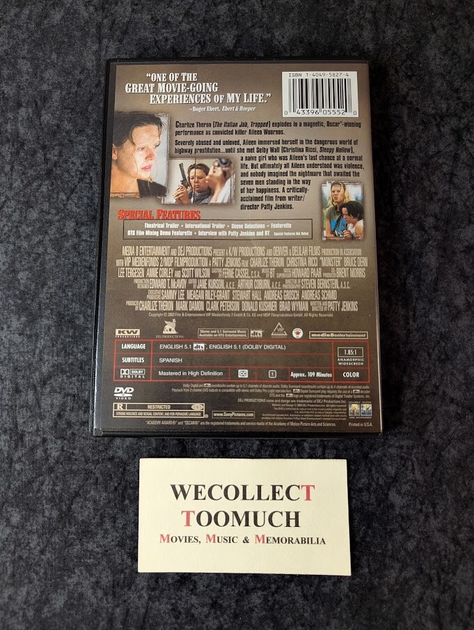 'Monster' 2003 DVD 2004 Columbia Pictures Widescreen First Edition Patty Jenkins Crime Drama Starring Charlize Theron, Christina Ricci, Bruce Dern, Lee Tergesen, Annie Corley & Scott Wilson Item in Perfect Condition DVD & Artwork Perfect Case Perfect (See Pics) From a Friend's Estate who was a Movie Discographer & Music Archivist Played Once for Archiving & Is In Brand New But Not Sealed Condition (Unless Described Differently) I Combine Shipping !!! I will Refund Additional Postage for Multiple Orders Purchased or You can Send Me a List of Items You are Interested in so I can Create a Buy It Now Just for You with the Correct Postage !!! Returns Accepted for Full Refund... Photo Above Shows how the Item Will be Shipped... I use Both a Bubble Wrap Bag & a Box... Pricing Research done thru eBay Sold Listings...