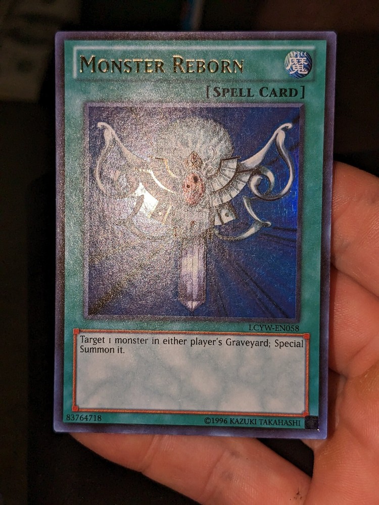 Yu-Gi-Oh - Monster Reborn, LCYW-EN058, Unlimited, Ultra Rare, Near Mint The set features many cards linked with Yugi Muto and his opponents. Cards 1 to 102 were used by Yugi Muto and Yami Yugi or related to cards that they used. Cards 103 to 118 were used by Maximillion Pegasus. Cards 119 to 128 were used by Yami Bakura or related to him. Cards 129 to 142 were used by Rafael or related to cards he used. Cards 143 to 148 were used by Yami Marik. Cards 149 and 150 were used by Mai Valentine. Cards 151 to 153 were used by Keith Howard, under Marik Ishtar's control. Cards 154 to 156 were used by Solomon Muto. This set also debuted 1 card in the TCG: Prior to the release of this set, "Kanan the Swordmistress" was OCG-exclusive. "Bowganian" was specifically released as a Super Rare in this pack to fulfill the request of a person asking for a foil release of "Bowganian" for his little brother. Each pack contains: 1 Secret Rare 1 Ultra Rare 1 Super Rare 1 Rare 5 Common In a set, there are: 59 Secret Rare 47 Ultra Rare 44 Super Rare 37 Rare 119 Common The card will be shipped in a card sleeve, top loader and a team bag. All of these will be placed inside a semi sturdy card and envelope then shipped.