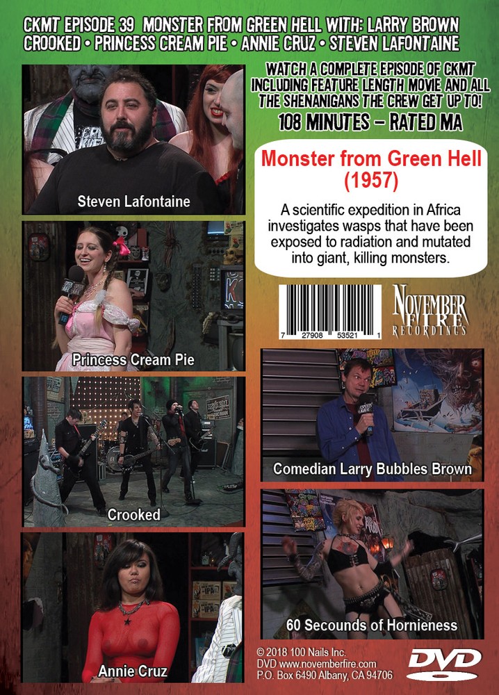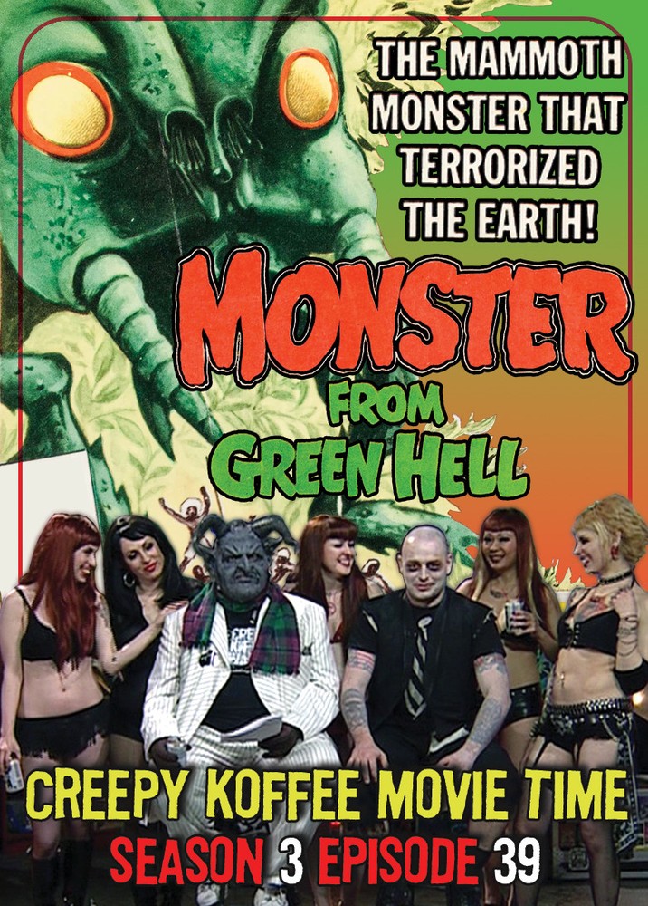 Monster from Green Hell (1957) CKMT Creepy Koffee Movie Time season 3 episode 39 A scientific expedition in Africa investigates wasps that have been exposed to radiation and mutated into giant, killing monsters. Watch a complete episode of CKMT including feature length movie and all the shenanigans the Crew get up to! Hosted by Balrok the Demon and No Name! With: Comedian Larry Brown, Crooked, Princess Cream Pie, Annie Cruz, Steven Lafontaine, & 60 Seconds of Hornieness. 108 minutes - Rated MA This title is provided on professionally produced and packaged DVD-R media. Due to the rarity and special-interest nature of this film, a commercially-pressed DVD would not be financially feasible.