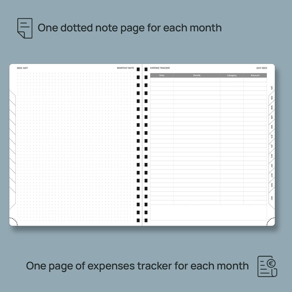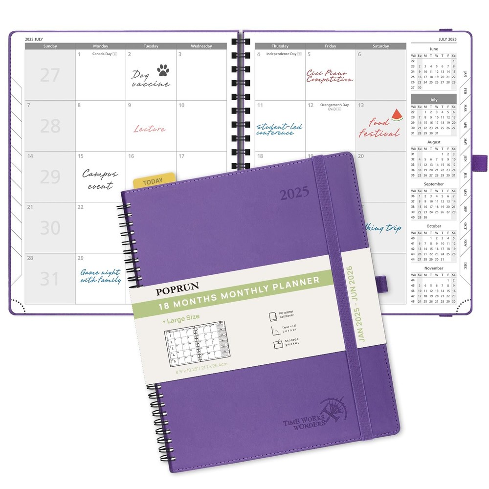 2025 PLANNER 18-MONTH MONTHLY PLANNER: This planner is used from January 2025 to June 2026, which is perfect for long term planning. Each month has a 2-Page spread with dotted notes and an expense tracker to help you manage deadlines and goals effectively. 4 PAGES PER MONTH:This 18-month planner (Jan.2025 - Jun.2026) presents a spacious and unique calendar-like design, which makes a whole month’s schedule appear at a glance. QUICK SEARCH FUNCTION: Flexible " TODAY " Ruler and Monthly tabs allow you to quickly browse and locate the current date. Besides; The Tear-Off Corners and Bookmark Ribbons are added to mark any wanted page of your choice. EXTRA PAGES: This 2025-2026 monthly planner also contains "2025-2026 Yearly Overview" Page + "2025-2026 Holiday & Calendar" Page + Monthly Expenses Page+ & Password Pages + 7 Dotted Notes Pages for jotting down your ideas, thoughts or any other happy things in detail. FSC THICK PAPER: The use of ecological 100GSM paper from sustainable forests makes it silky smooth to write on and ink resistant, bringing you the ultimate writing experience.