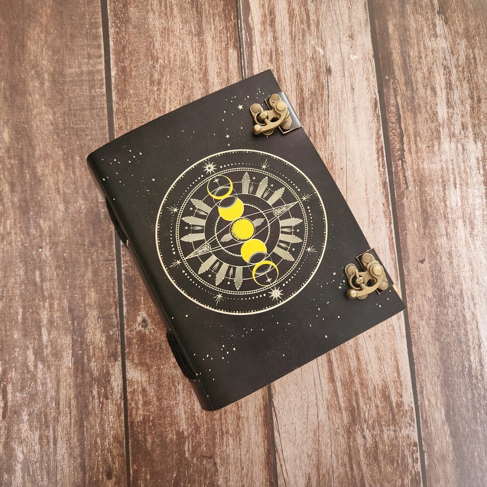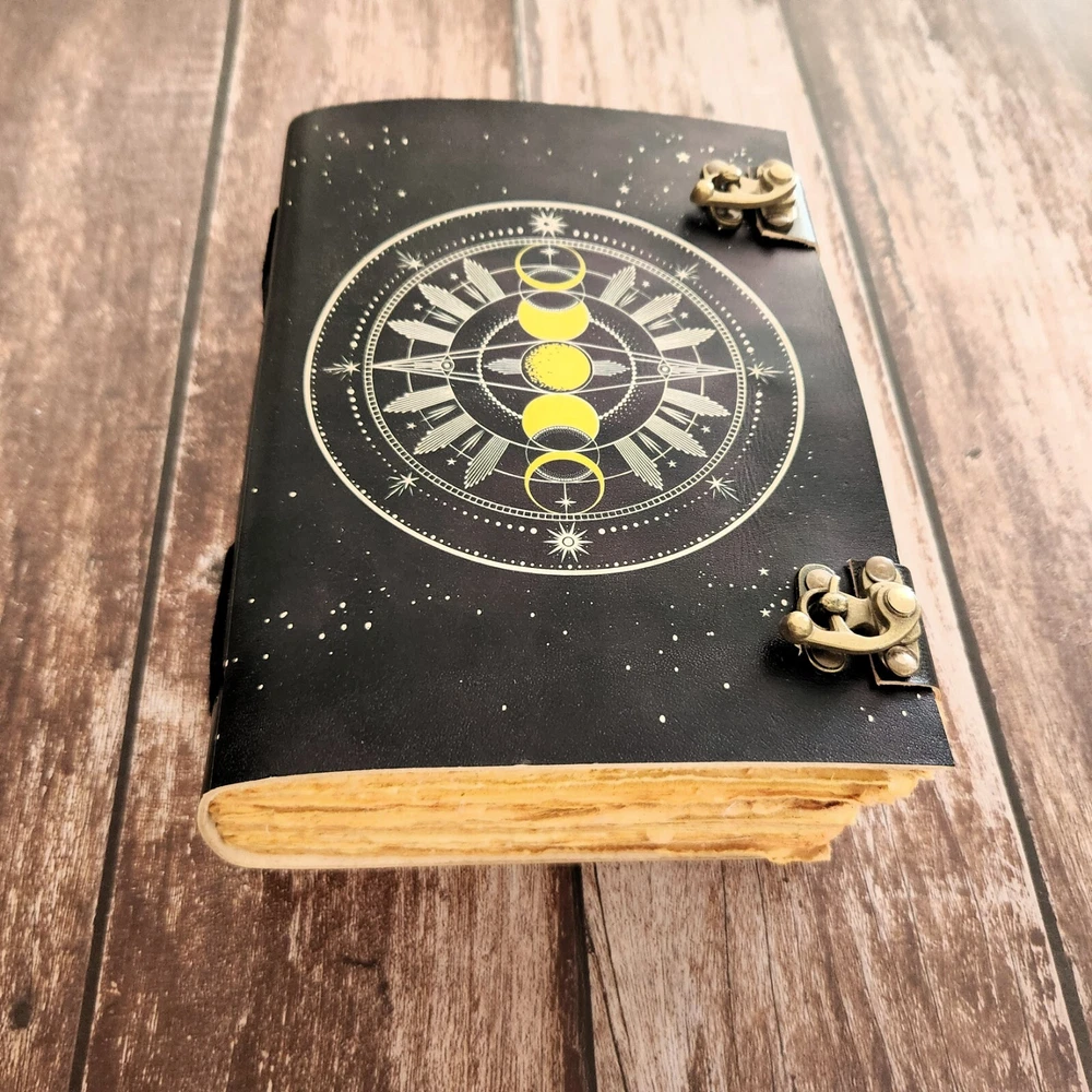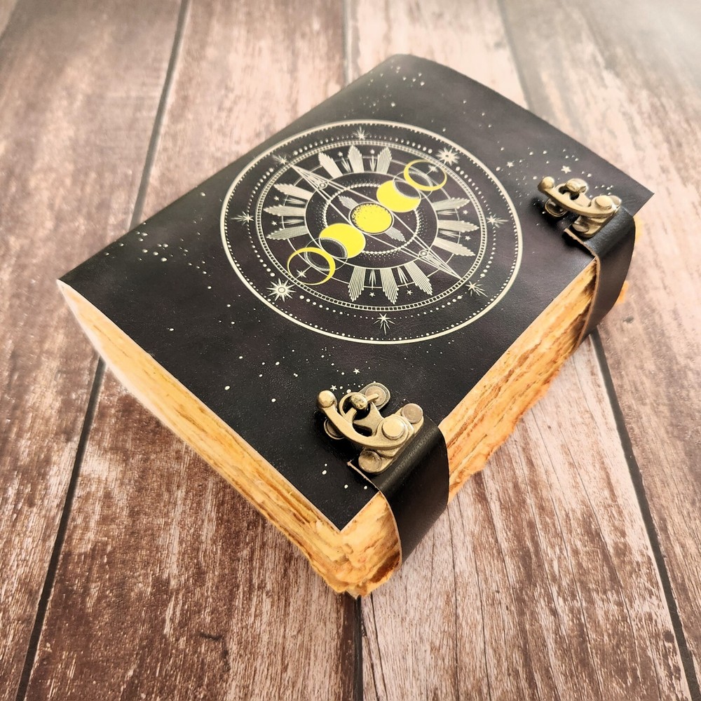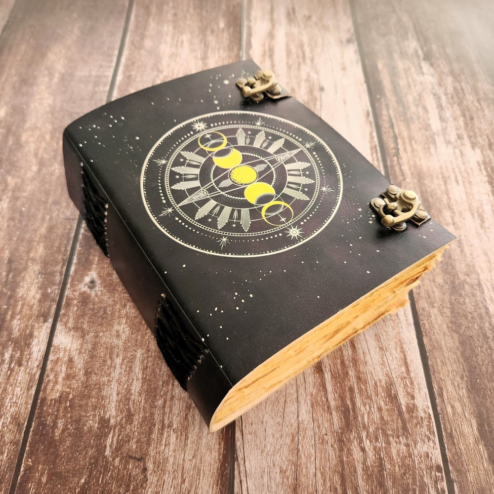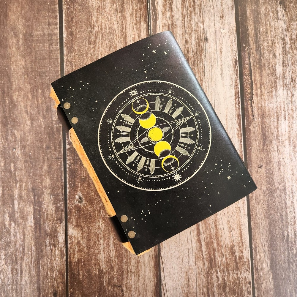 Elevate creativity and cherish memories with this premium handcrafted leather journal. Whether it's a thoughtful wedding gift, a personalized keepsake, or a versatile dream journal, this piece is designed to inspire. Key Features: Genuine Leather Craftsmanship: Made from high-quality leather, each journal boasts a unique texture and durable design that ages beautifully over time. Unique Moon Eclipse Clock Print: An exquisite cover design that adds a celestial touch, perfect for dreamers and creatives. Deckle Edge Pages: The hand-torn edges give a vintage charm, making this journal a perfect blend of modern artistry and classic aesthetics. Multiple Sizes & Page Counts: Choose the size and capacity that suits your needs: 200 Pages (Standard) 400 Pages (Extended) 600 Pages (Maximal) Secure Lock Closure: Protects your thoughts, sketches, and notes with a functional and stylish lock mechanism. Personalized Gift Option: Add a unique touch by personalizing it for a loved one or as a cherished keepsake. Uses: Dream Journal Sketchbook Diary Wedding Gift Personal Notebook Size: 8x6 inches A perfect blend of practicality and elegance, this journal is ideal for artists, writers, and those who value meaningful, personal gifts. GPSR Details Manufacturer Detail : Dilshad Fatima Manufacturer Contact : [email protected] Product Safety Warnings : The product is real Leather Hand Made Item, which is free from any harm, Its cruelty free leather product for General use. Warning : Keep it safe from Heavy water flow, Do not leave under direct sunlight for long time.