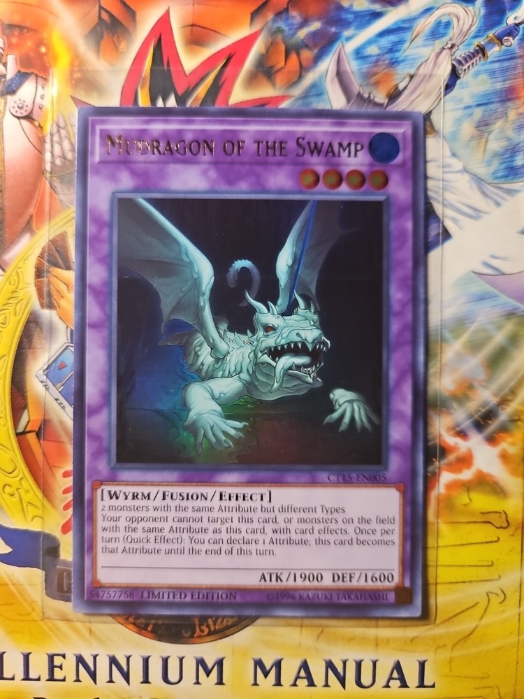 The "Mudragon of the Swamp" card is an Ultra Rare limited edition card from the 2018 Mega-Tins set in the Yu-Gi-Oh! TCG. Manufactured by Konami, this Fusion Monster card belongs to the Attribute Water and has a power of 1900 and toughness of 1600. It features the Wyrm Creature Type and is designed with both English text and language. With its unique abilities and rarity, this card is a valuable addition to any collector's deck.