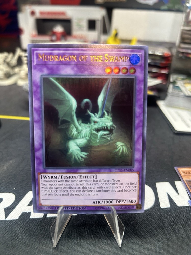 Introducing the limited edition Mudragon of the Swamp CT15-EN005 card from the 2018 Mega-Tins set of the Yu-Gi-Oh! TCG. This ultra rare card features a Water attribute and Wyrm creature type, with a defense/toughness of 1600 and attack/power of 1900. It is an effect and fusion card, perfect for any collector or player looking to add a unique and powerful card to their deck. This card is manufactured by Konami and comes in English language. It is a must-have for any fan of the Yu-Gi-Oh! TCG, with its stunning design and limited availability. Don't miss out on the chance to own this rare and sought-after card.