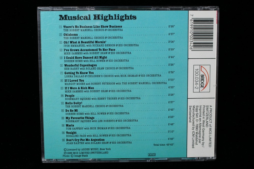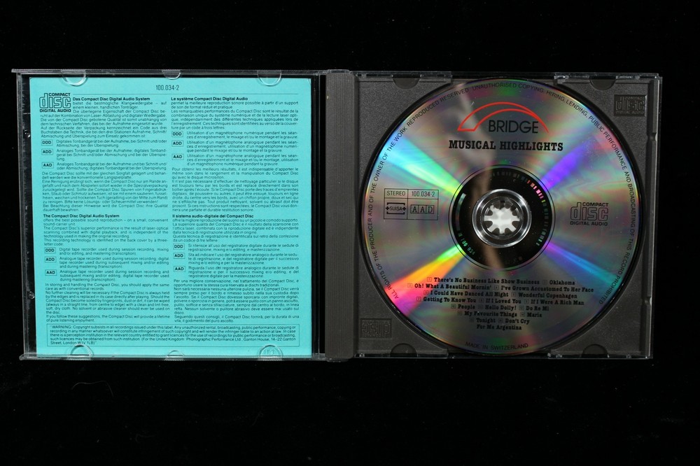 Musical Highlights - Annie Get Your Gun, Oklahoma, My Fair Lady, Hello Dolly CD Musical Highlights - Annie Get Your Gun, Oklahoma, My Fair Lady, Hello Dolly CD The pictures show are the actual CD that you will get. We take the time to take a picture of what you are buying. Not like the other sellers that will just use a stock picture (not showing you what will arrive to your house). The CD has no scratches and will arrive in great condition. To protect the Jewel Cases they will arrive in heavy duty cardboard Mailers (unlike the cheep plastic mailers that others may use which may causing your case to arrive broken.) The inserts are also in like new condition. inventory c