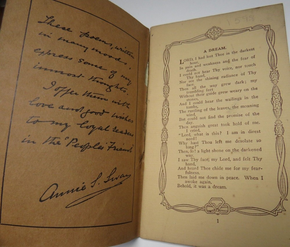 For Sale - My Poems By Annie Swan Date - Author - Annie Swan Pages - 32 Height of book - 16.5 cm Publisher & Place - John Leng & Co Ltd Dundee and London . Condition - the spine is held together with tape. Front and back attached only by tape
