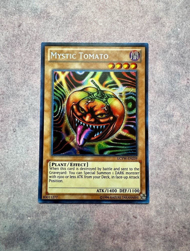 Premium Yu-Gi-Oh cards, all in “mint” or “near mint” condition. These cards have been meticulously cared for and have never been played with. From the moment they were opened, each card was placed in protective sleeves, ensuring they remain in pristine condition. Ideal for collectors and players who appreciate high-quality cards. This exceptional level of care applies to all my other card listings as well. Secure these top-notch cards for your collection today! The "Mystic Tomato" card is from the Legendary Collection 3: Yugi's World set of the Yu-Gi-Oh! TCG. It is a Dark attribute Plant-type monster with 1400 Attack and 1100 Defense points. This Secret Rare card with card number LCYW-EN239 is in English and manufactured by Konami. The card is an Effect type and belongs to the Unlimited edition.