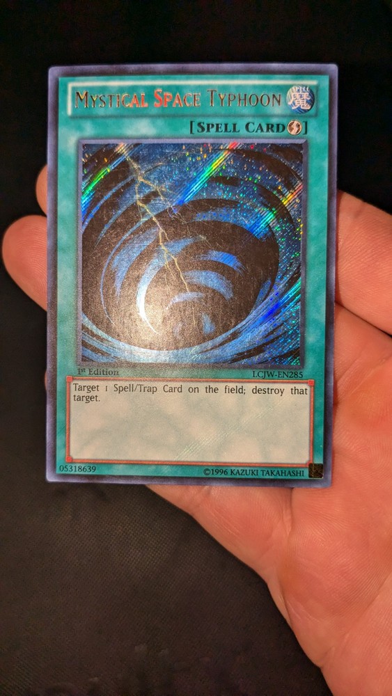 Enhance your Yu-Gi-Oh! TCG collection with the powerful Mystical Space Typhoon from the Legendary Collection 4: Joey's World. This Secret Rare card, numbered LCJW-EN285, is a must-have for players and collectors alike, featuring the iconic 1st Edition stamp that signifies its rarity and significance in the game's history. As a Spell-Normal card produced by the renowned Konami, this English language version of Mystical Space Typhoon offers both strategic gameplay potential and a prized piece for your collection. Don't miss the opportunity to own a card that's essential for any serious duelist or collector in the Yu-Gi-Oh! universe.