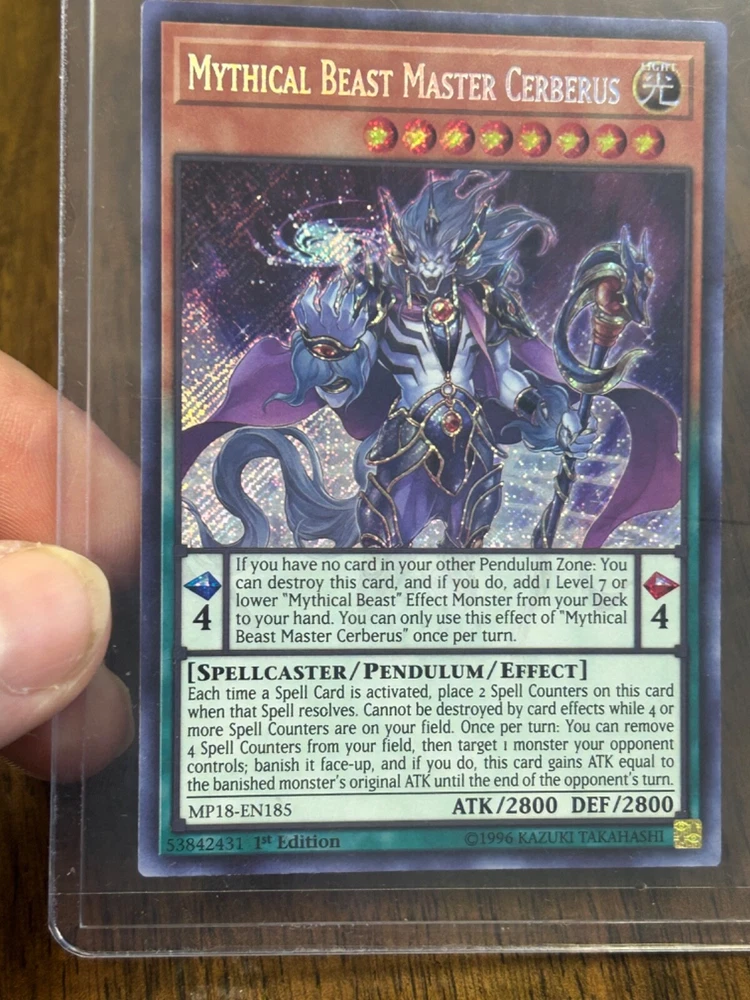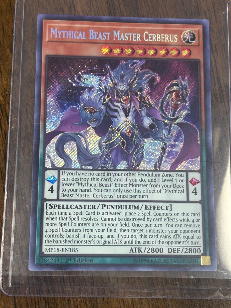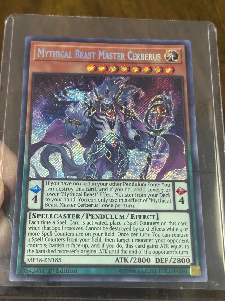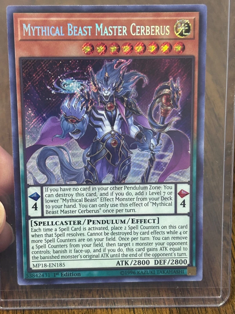 This rare and highly sought-after card features the powerful Mythical Beast Master Cerberus, with 2800 defense and attack. It is a 1st Edition card from the 2018 Mega Tins Mega Pack, with a Secret Rare rarity and a stunning Holo finish. The card is an Effect Pendulum type, with the card number MP18-EN185, and it is manufactured by Konami. The card is in English language and is perfect for collectors and fans of the Yu-Gi-Oh! TCG game.