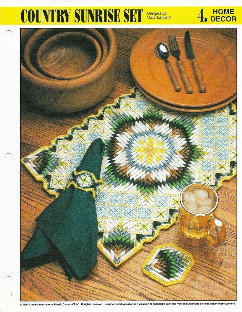 FLAT RATE SHIPPING! EACH ADDITIONAL ITEM SHIPS FOR FREE WHEN PAID TOGETHER ON THE SAME INVOICE. ADD ALL ITEMS TO YOUR CART AND WHEN YOU ARE FINISHED SHOPPING, THE DISCOUNT WILL AUTOMATICALLY BE APPLIED WHEN YOU GO TO CHECKOUT. PATTERN WILL BE MAILED FLAT WITH CARDBOARD TO PROTECT FROM BENDING. TRACKING NUMBER WILL BE PROVIDED FOR YOU TO TRACK YOUR ORDER. New Plastic Canvas Pattern Instructions with Color Charts from Annie's International Plastic Canvas Club Binder. Materials Required: 7 Mesh Plastic Canvas and Worsted Weight Yarn are used to make the 3 Designs. Finished Sizes: Coaster is 3 1/2" x 3 1/2". Napkin Ring is 2 1/2" in diameter. Place Mat is 13 1/2" x 19". PET AND SMOKE FREE Many More Patterns In My Store For Plastic Canvas, Crochet, Cross Stitch, Knitting And More. No Material Or Supplies Are Included With Purchase. This Listing Is For The Pattern Instructions Only For You To Make The Item Yourself. Free Shipping On Each Additional Item When You Add Items To Your Cart And Pay For All Items On One Invoice. NO REFUNDS On Shipping If You Pay For Items Individually And Not On The Same Invoice. ,