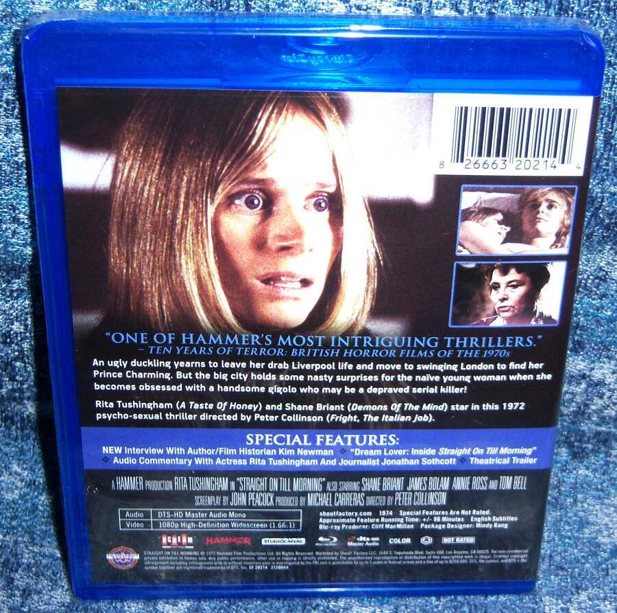 NEW RARE OOP SCREAM FACTORY STRAIGHT ON TILL MORNING THRILLER MOVIE BLU RAY 1972 DESCRIPTION: NEW RARE OOP SCREAM FACTORY STRAIGHT ON TILL MORNING THRILLER MOVIE BLU RAY 1972 THIS LISTING IS FOR A BRAND NEW IN THE ORIGINAL SHRINK WRAP 1 DISC BLU RAY. THE OUTER PACKAGE IS FACTORY SEALED. THE ITEM SHOWN IN THE PICTURE IS MY STOCK PHOTO AND IS FOR REFERENCE ONLY. (HAVE MORE THAN ONE TO SELL) THIS DOES NOT COME WITH A SLIPCOVER OR DIGITAL CONTENT. BE CAREFUL OF CHEAP IMPORTS OTHER PEOPLE ARE SELLING. THIS IS THE REAL DEAL USA VERSION. THIS SET IS FROM A SMOKE-FREE HOME. NEW RARE OOP SCREAM FACTORY STRAIGHT ON TILL MORNING THRILLER MOVIE BLU RAY 1972 The UPC is 826663202144. This is also retired and out of print. Description: An ugly duckling yearns to leave her drab Liverpool life and move to swinging London to find her Prince Charming. But the big city holds some nasty surprises for the naïve young woman when she becomes obsessed with a handsome gigolo who may be a depraved serial killer! Rita Tushingham (A Taste Of Honey) and Shane Briant (Demons Of The Mind) star in this 1972 psycho-sexual thriller directed by Peter Collinson (Fright, The Italian Job). Special Features : Presented In Two Aspect Ratios – 1.66:1 And 1.85:1 NEW The Morning After – An Interview With Author/Film Historian Kim Newman Dream Lover: Inside STRAIGHT ON TILL MORNING Audio Commentary With Actress Rita Tushingham And Author/Film Historian Jonathan Sothcott Theatrical Trailer THIS EDITION INCLUDES: MPAA rating : NR Region: A (USA and Canada) Director : Peter Collinson Media Format : BLU RAY, Color , NTSC, Widescreen, Subtitles Run time : 1 hour and 35 minutes Release date : September 17, 2019 (1974 original production) Actors : Rita Tushingham, Shane Briant, James Bolam, Annie Ross, Tom Bell Studio : Scream Factory Language: English Subtitles: English Country of Origin : USA Number of discs : 1 SHIPPING INFORMATION: FREE USA SHIPPING VIA USPS MEDIA MAIL SHIPPING WITH DELIVERY CONFIRMATION. USPS GROUND ADVANTAGE UPGRADE IS AVAILABLE UPON CHECKOUT FOR A SMALL FEE. (A LITTLE FASTER) DUE TO THE POST OFFICE ONCE AGAIN RAISING THEIR SHIPPING RATES OVER 14% THIS YEAR, AND ALSO CHARGING MORE MONEY FOR ZONES FROM MY STATE- ALL MY ITEMS WILL HAVE TO SHIP THE CHEAPEST METHOD TO OFFER THE FREE SHIPPING. I AM GIVING EACH PERSON THE CHOICE TO UPGRADE FOR A SMALL FEE FOR THE SLIGHTLY FASTER SHIPPING, SO IF YOU CHECK THE MEDIA MAIL OPTION, THEN SIT BACK AND BE PATIENT FOR YOUR ITEM TO ARRIVE. PAYMENT INFORMATION Accepted Payments PayPal Payment upon pickup of item locally. SHIPPING INFORMATION Standard Shipping Rates I ship to USA and Canada. . I am not responsible for duties, taxes or other fees associated with shipping. SHIPPING DISCOUNTS I am happy to combine shipping on MOST items for multiple purchases to reduce total shipping charges. Each item description indicates shipping discount eligibility status. RETURN POLICY · Broken or Lost Item Return Policy · Defective Item Return Policy All items are carefully inspected prior to shipping. In the event you receive a defective item, please contact me immediately. We will work together to resolve the issue. Other Items Feedback Contact eBay Store txzj pxzj34871 txzj111