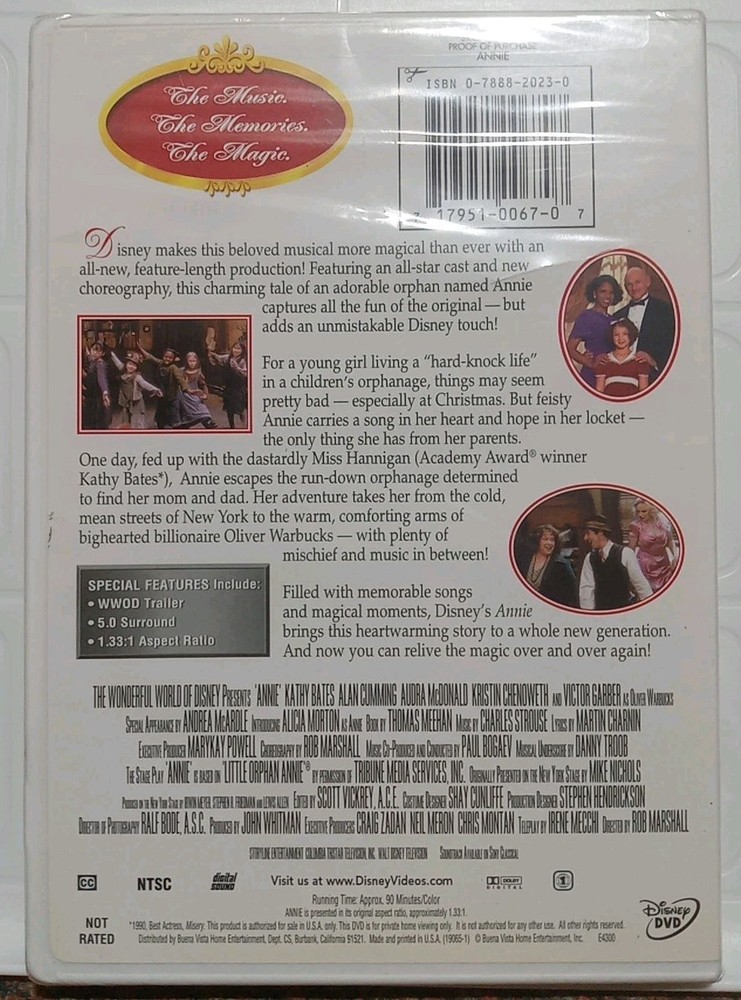 This product is a new, sealed DVD of the movie "Annie" in the Wonderful World of Disney collection. Directed by Rob Marshall and starring Kathy Bates and Victor Garber, this family-friendly film was released in 1999 and is presented in NTSC video format. The DVD comes in a tall/DVD case and is in English language, suitable for Region 1 (US, Canada) players. Perfect for fans of classic Disney movies, this vaulted DVD would make a great addition to any home movie collection.