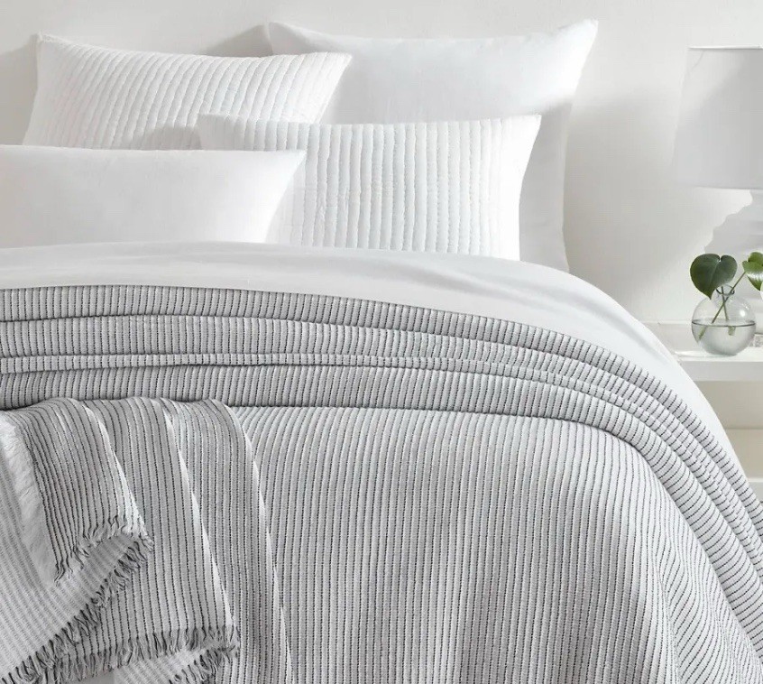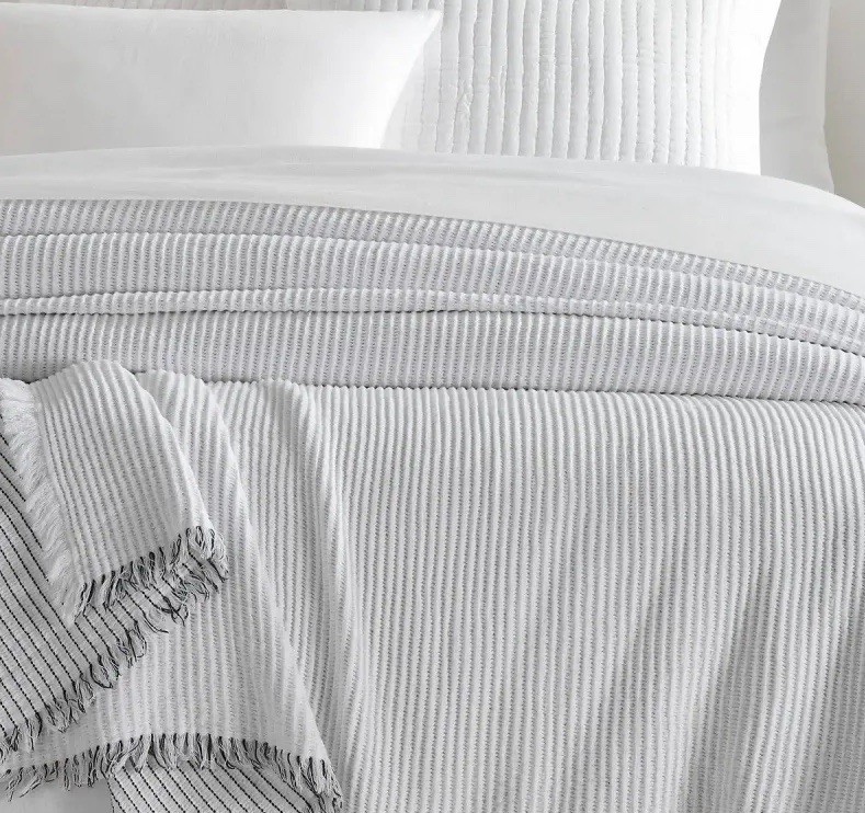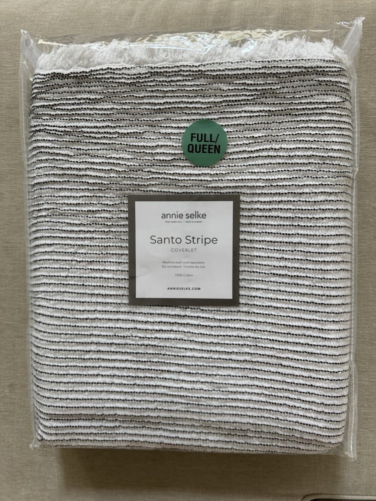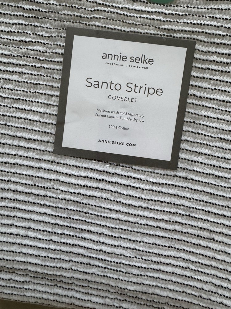 NWT Annie Selke/Pine Cone Hill Santo Stripe Black Coverlet Size: Full/Queen This airy and lofty matelassé coverlet is woven in the softest of cotton for superb texture and drape. Organically undulating black pin-dot stripes on a white waffle ground reverse to a solid white ground. Finished with a simple white fringe on the width sides and a variegated black and white fringe on the bottom edge. Crafted by artisans committed to fair-labor practices. Pine Cone Hill’s fresh, fun home linens have been making waves in the home design industry since 1994, when Annie Selke started the business with a sewing machine in her dining room. From the very beginning, Annie’s Pine Cone Hill creations have consistently wowed the home décor industry. Each month, her innovative designs and interiors are splashed liberally throughout the pages of top shelter magazines. SKU PCHPC4069-FQ Single side stripe. Reverse is solid white. 1" fringe on 3 sides. 1" top hem. Made in Portugal. 100% Cotton Edging: Fringe/Tassel Machine wash cold, separately. Do not bleach. Tumble dry low. Full/Queen: 90" x 96"