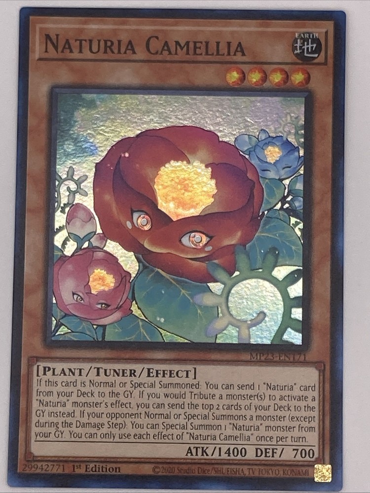 Elevate your Yu-Gi-Oh! TCG strategy with the Naturia Camellia card from the 25th Anniversary Tin: Dueling Heroes Mega Pack. As an Effect Tuner card, it plays a pivotal role in disrupting your opponent's rhythm and setting the stage for your next offensive move. With its Super Rare rarity and the prestige of being a 1st Edition card, Naturia Camellia, card number MP23-EN171, is a standout addition to any deck. The card features the Earth attribute and boasts a substantial attack power of 1400, coupled with a formidable defense of 700, making it a force to be reckoned with during gameplay. Designed for players aged 6 and up, this English-language card adheres to the standard card size dimensions and is brought to you by the renowned game creator, Konami. Enhance your collection and gameplay with the tactical depth of Naturia Camellia. Thank you for viewing our Yu-Gi-Oh cards on eBay! This card has come straight from the booster pack straight to a penny sleeve. If you have any questions or issues, please do not hesitate to reach out to us! We will do everything we can to assist you! Thank You!