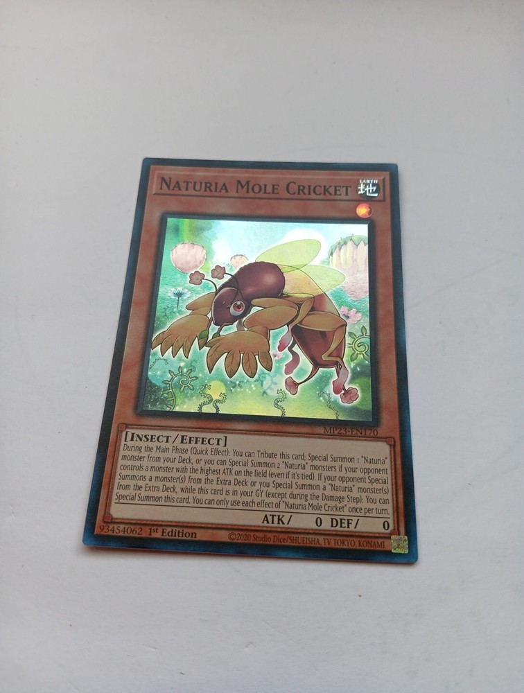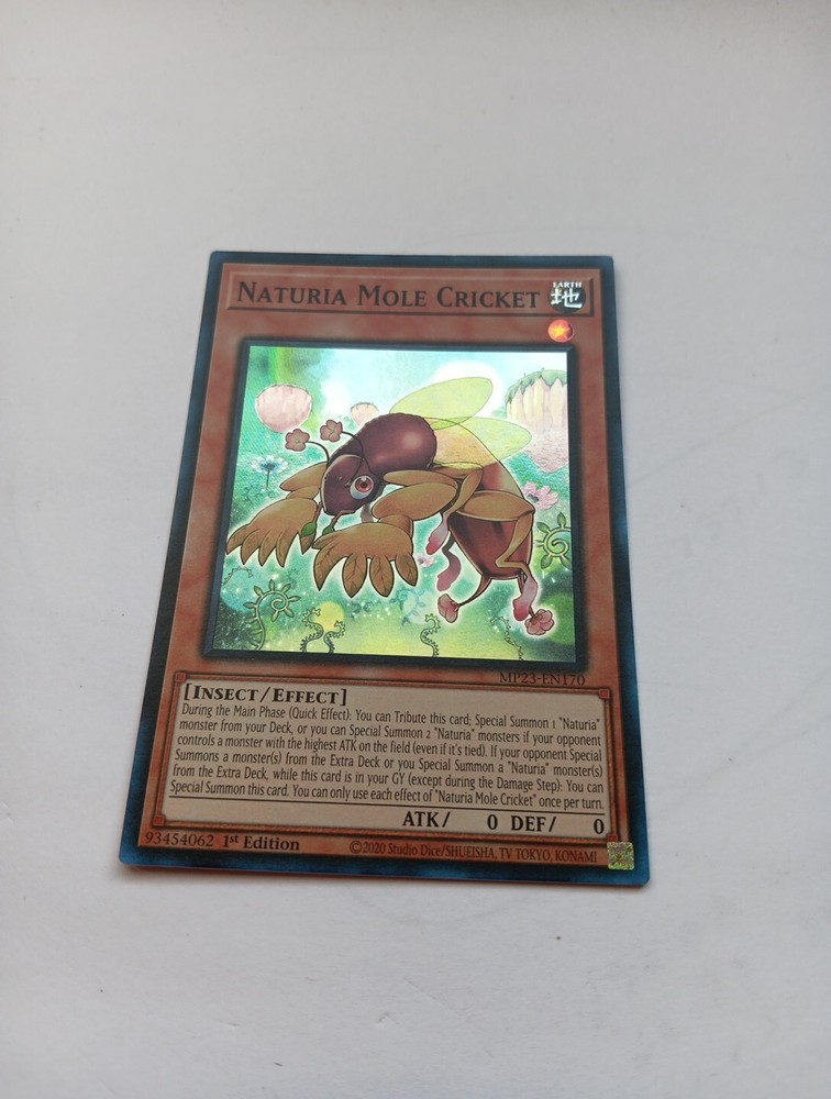 This is a super rare Naturia Mole Cricket card from the Yu-Gi-Oh! TCG game. It features the hero creature type and is part of the 25th Anniversary Tin: Dueling Heroes Mega Pack set. The card is in English language and has the card number MP23-EN170. It is a 1st edition card and has no defense or toughness. The attack/power of the card is 0. This card is manufactured by Konami and is perfect for collectors of CCG individual cards.