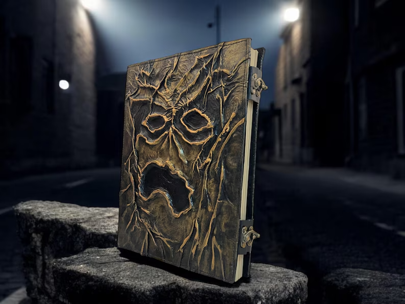 Necronomicon Dead Evil Book – The Dark & Horror Movie Prop Decor Notebook Unlock the ancient terror with this Necronomicon Dead Evil Book , a spine-chilling replica inspired by the cult classic Evil Dead horror franchise. Crafted for fans of the macabre and collectors of the supernatural, this notebook doubles as a nightmarish piece of decor and a functional journal for your darkest thoughts, sketches, or arcane rituals. Authentic Horror Look – Featuring a grotesque face molded into the cover and aged pages that give it an ancient, cursed appearance straight out of the movie. Functional Notebook – Not just for show—this prop opens to reveal blank or themed pages, perfect for journaling, sketching, or scripting your next horror story. Creepy Decor Accent – Makes a standout centerpiece for Halloween displays, haunted houses, horror-themed rooms, or as a conversation starter in your collection. Movie-Inspired Design – Faithfully designed to mirror the infamous "Book of the Dead" from Evil Dead , it’s ideal for cosplay, fan tribute displays, or film props. Whether you're summoning ancient evils or just scribbling down your grocery list with a touch of the macabre, this Necronomicon notebook brings a sinister flair to the everyday. A Hardcover Leather Journal is a premium, durable notebook designed for those who appreciate both style and functionality. It features a sturdy leather cover that provides a luxurious feel while ensuring longevity. The leather surface often has a smooth, textured finish, with some journals showcasing natural imperfections, giving each one a unique character. Inside, the journal typically contains high-quality, acid-free paper that’s perfect for writing, sketching, or journaling. These journals often come with features like: Elastic Band : To keep the journal securely closed when not in use. Bookmark Ribbon : To easily mark your place for quick access. Pen Holder : To carry your favorite pen along with the journal. Vintage or Modern Design : Depending on the style, it can either have an antique, rustic look or a more sleek, modern design. Personalization Options : Many leather journals offer customization options, such as embossing names or initials for a more personal touch. A Hardcover Leather Journal is often seen as the perfect companion for writers, travelers, or anyone who values keeping thoughts, sketches, and ideas in a beautiful, durable format. It also makes an excellent gift due to its timeless appeal.