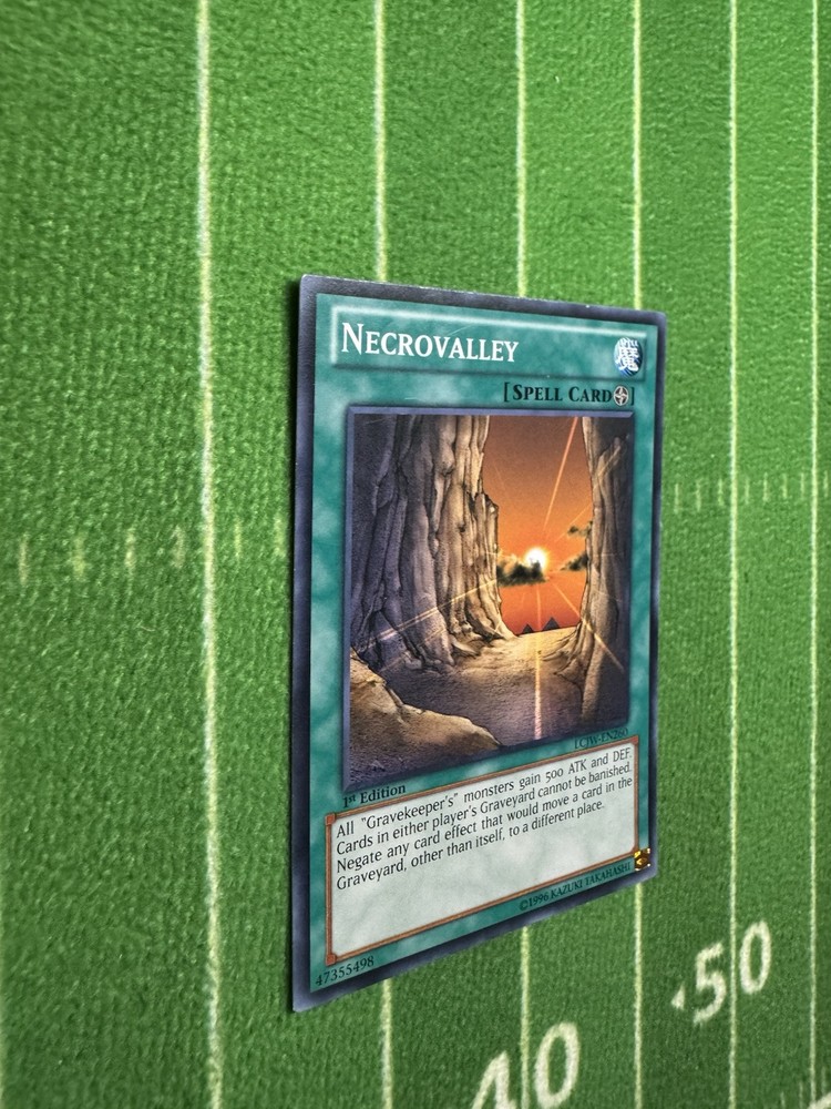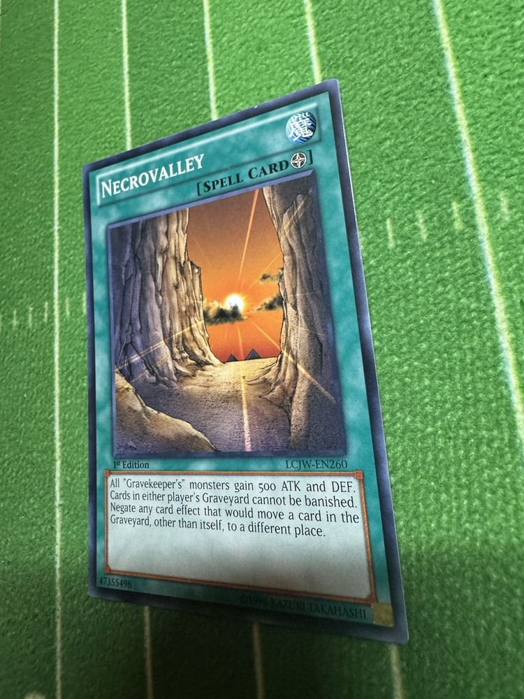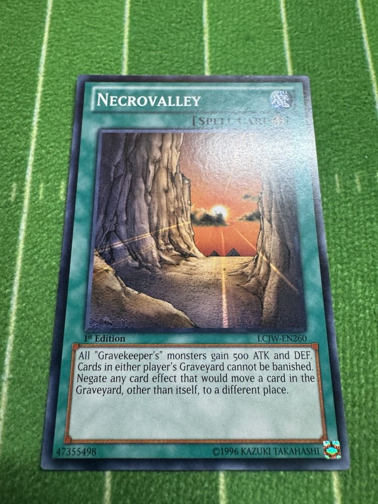 The product is the "Necrovalley" card from the Yu-Gi-Oh! TCG set, Legendary Collection 4: Joey's World. It is a 1st Edition Common/Short Print card with the card type Spell-Field and card number LCJW-EN260. Manufactured by Konami, the card is in English language and is a part of the collectible card game category. The card's specific attributes include being a Spell card that belongs to the Color attribute and features the game element of controlling the field with its effect.