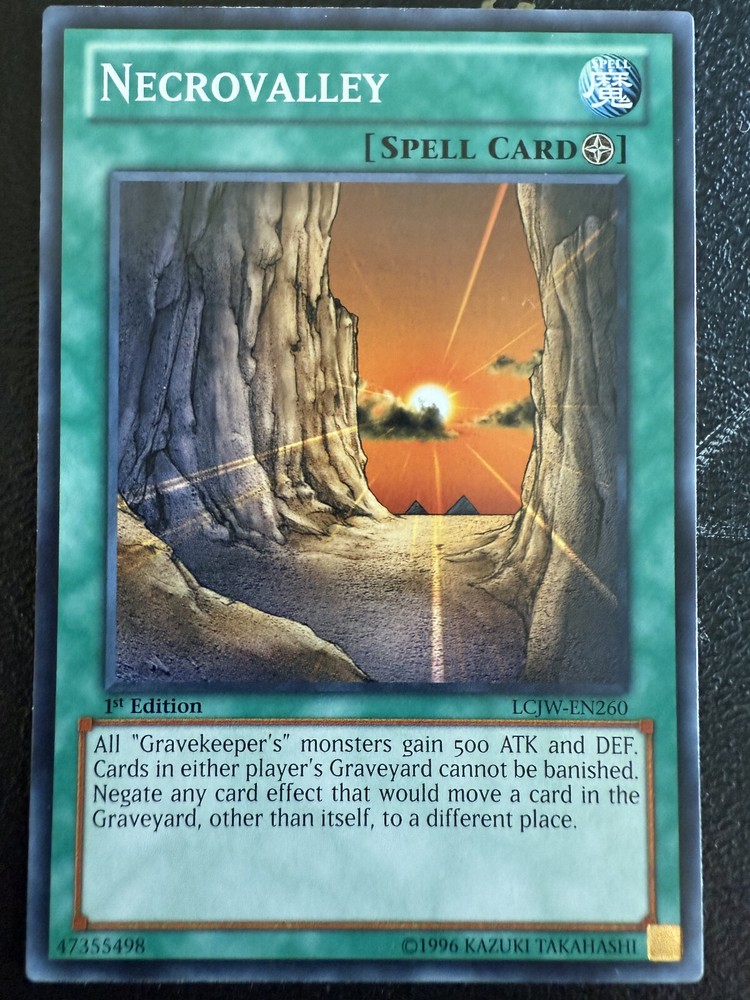 The Necrovalley LCJW-EN260 card is a Yu-Gi-Oh! TCG collectible from the Legendary Collection 4: Joey's World-1st Edition set. Manufactured by Konami, this English language card belongs to the Spell-Field category with a common/short print rarity. It features the unique attribute of "Spell" and is a sought-after addition for collectors and players of the game. The 1st Edition feature adds to its appeal, making it a valuable addition to any Yu-Gi-Oh card collection.