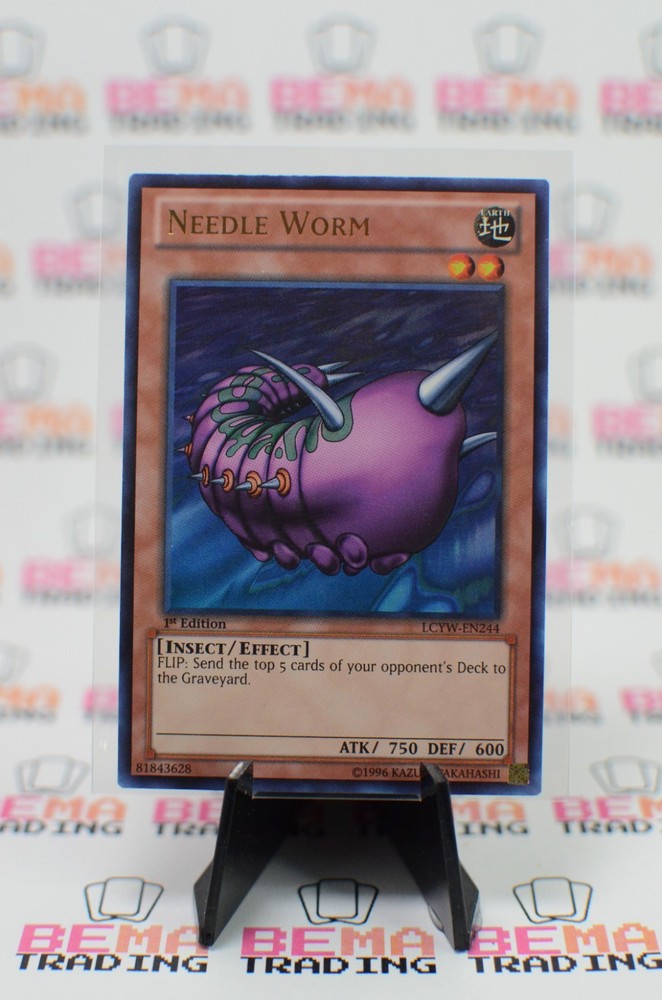Game: Yu-Gi-Oh! Card: Needle Worm - 1st Edition Set: Legendary Collection 3: Yugi's World Condition: Near Mint Card Details Collector Number: LCYW-EN244 Rarity: Ultra Rare Card Type: Effect Monster Monster Type: Insect Attack: 750 Defense: 600 Description: FLIP: Discard 5 cards from the top of your opponent's Deck to the Graveyard. Attribute: EARTH