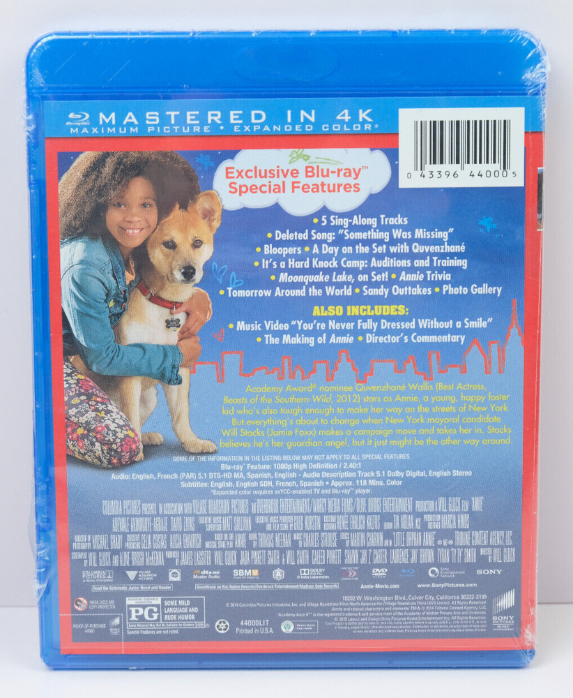 Brand new and unopened Blu-ray + DVD copy of Annie (2014). There is a tear in the plastic packaging; please see photos for details....