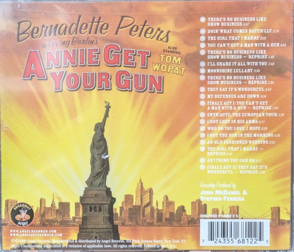 Get ready to have your breath taken away with this Broadway Cast Recording of Annie Get Your Gun. This CD features the original soundtrack of the 1999 revival cast, led by Bernadette Peters and Tom Wopat. With a runtime of 52 minutes, this album is packed with traditional and vocal style songs that will transport you to the Wild West. The CD comes in a standard jewel case, with a multicolor design that complements the album's theme. The inlay and case conditions are both mint, ensuring that this album will be a cherished addition to your collection. Produced by John McDaniel and Stephen Ferrera, this album is a must-have for fans of classic pop vocals and pop vocal genre.