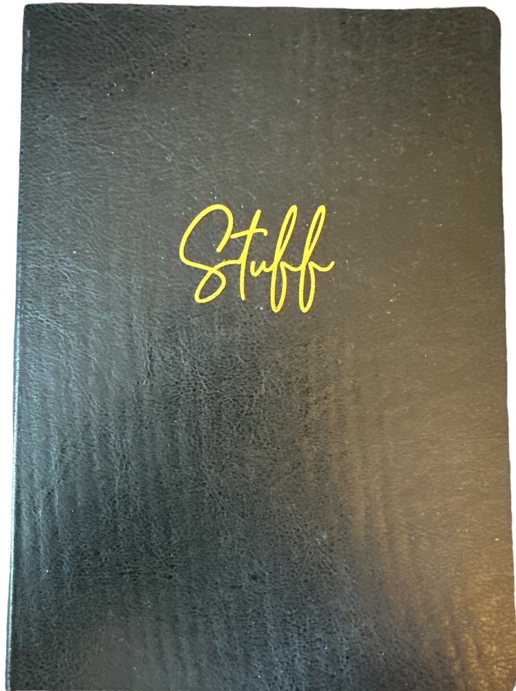 This is a soft PU, vegan, leather bound journal . It is in black with the word “ Stuff ” written on the front cover in gold cursive font . It has 64 unlined cream colored sheets . It has front and back craft paper cover sheets . Perfect for journaling, sketching, notes, list and more. Compact note pad in a perfect size for travel, fits easily in your bag or backpack . In new with tags condition . ————— NEW CONDITION: May have shelf wear to the packaging and/or tags of new items, including new old stock items. This may include bends, dents, markings that do not affect the item’s intended use. The exception is a listed as new with defects or open box item in which any defect will be described within the description. PRE-OWNED CONDITION: May have some expected minor imperfections, from age and/or use. I make every effort to describe any significant differences than normal expected wear. SIZE, MEASUREMENTS & OTHER INFORMATION: Size, measurements, weight and more should be found in either the item description, title or specifics. If you cannot find the necessary information you need then please contact seller to ask. PHOTOS: By examining all photos closely, an item will provide a tale of its history and condition much louder than any written description a seller could provide. If in doubt, then please contact seller to ask. CARE INSTRUCTIONS: I recommend that all items, new and old, to be cleaned prior to use. Some items, especially textiles, may hold residual odors from environmental conditions prior to being sourced. Most, items are sold as found and photo’d. Buyer accepts responsibility for all further care. SHIPPING: Browse my store! eBay will automatically combine shipping, if you pay for your purchases together from your cart and save you on shipping charges. If there is a significant difference of calculation overage paid, then rest assured, I will refund you the difference by sending you a partial combined shipping discount refund. I ship every 1-3 business days from date of purchase. RETURNS: I have a no return policy. I welcome all questions. If a potential buyer reads the condition, description, item specifics, examines all photos and ask any questions to clarify any concerns prior to purchase; then I am confident that the buyer will be satisfied with their purchase.