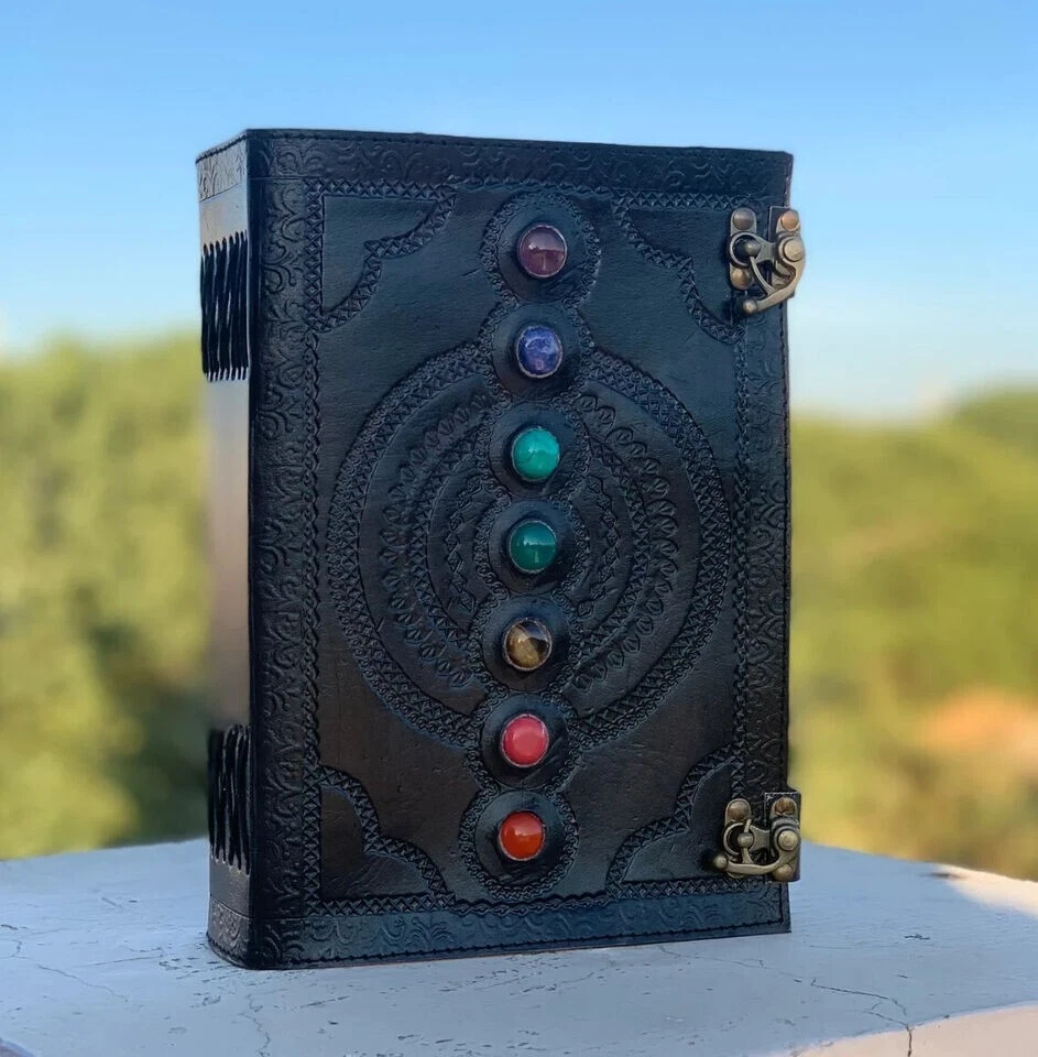 Extra Large Leather Journal Seven Stone Embossed Notebook With Blank Papers Personal Journal For Writing Mother's Day Gift For Her Gift For Mothers Handmade leather journal with seven different stone ( Semi Precious ) embedded and aligned in the center of the book. Size 10X7X3 Brown color extra large journal provided with 2 brass lock for enclose at corner edge for enhancing the distressed look of journal. Hand embossed notebook chakra design around all the 7 different stone which give a detailed fine handmade look to journal. Amazing embossed done on the front and the back side. Provided with 610 Sheets of paper ( pages counting on the both side ) Perfect for Gifts - Suitable for men or women this blank paper personal journal is a perfect gift for mother, writers, your loved once , family members, relatives, occasions, etc. This amazing journal with lock can be used as a handmade journal, refillable journal, embossed journal, personal journal, stone journal, spell book, journal with stones, book of shadows, etc. We guarantee high quality products and unique design. All made especially for you.