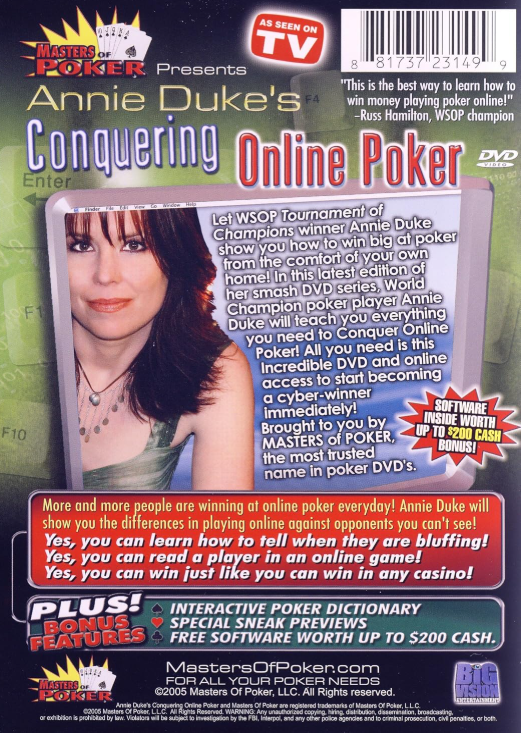 Masters of Poker Presents: Annie Duke's Conquering Online Poker (Platinum Edition) [DVD] Annie Duke (Actor) Rated: NR Format: DVD Let WSOP Tournament of Champions winner Annie Duke shows you how to win big at poker from the comfort of your own home! In this latest edition of her smash DVD series, World Champion poker player, Annie Duke will teach you everything you need to Conquer Online Poker! All you need is this incredible DVD and online access to start becoming a cyber-winner immediately! Brought to you by MASTERS of POKER the most trusted name in poker DVDs. Product details MPAA rating : NR (Not Rated) Product Dimensions : 0.7 x 7.5 x 5.4 inches; 2.72 ounces Media Format : NTSC, DVD, Color Run time : 1 hour Release date : February 28, 2006 Actors : Annie Duke Studio : Big Vision Number of discs : 1 49994
