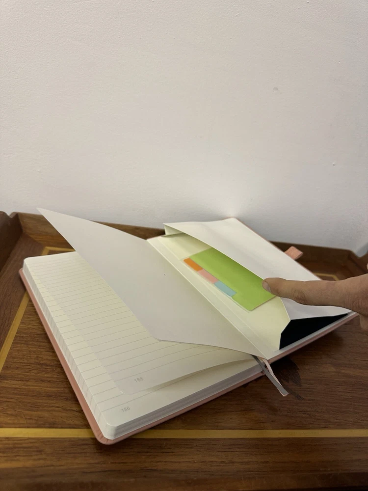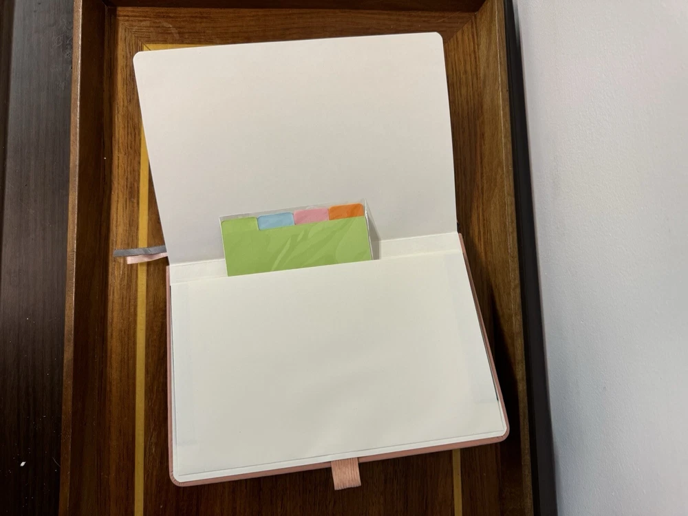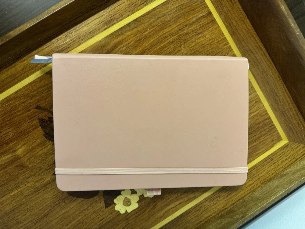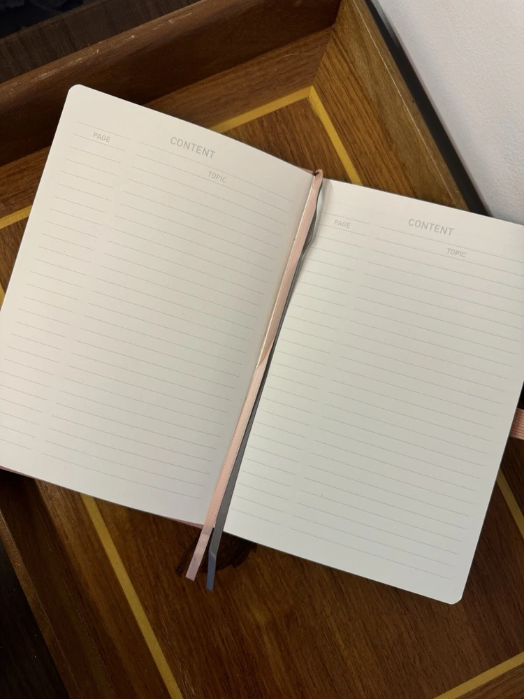 New unused Pink Leatherback Ruled Lined Journal. It has Index/Table of Contents Pages, a back pocket with organizer tabs, an elastic pen holder, an elastic band closure and two ribbon bookmarks.