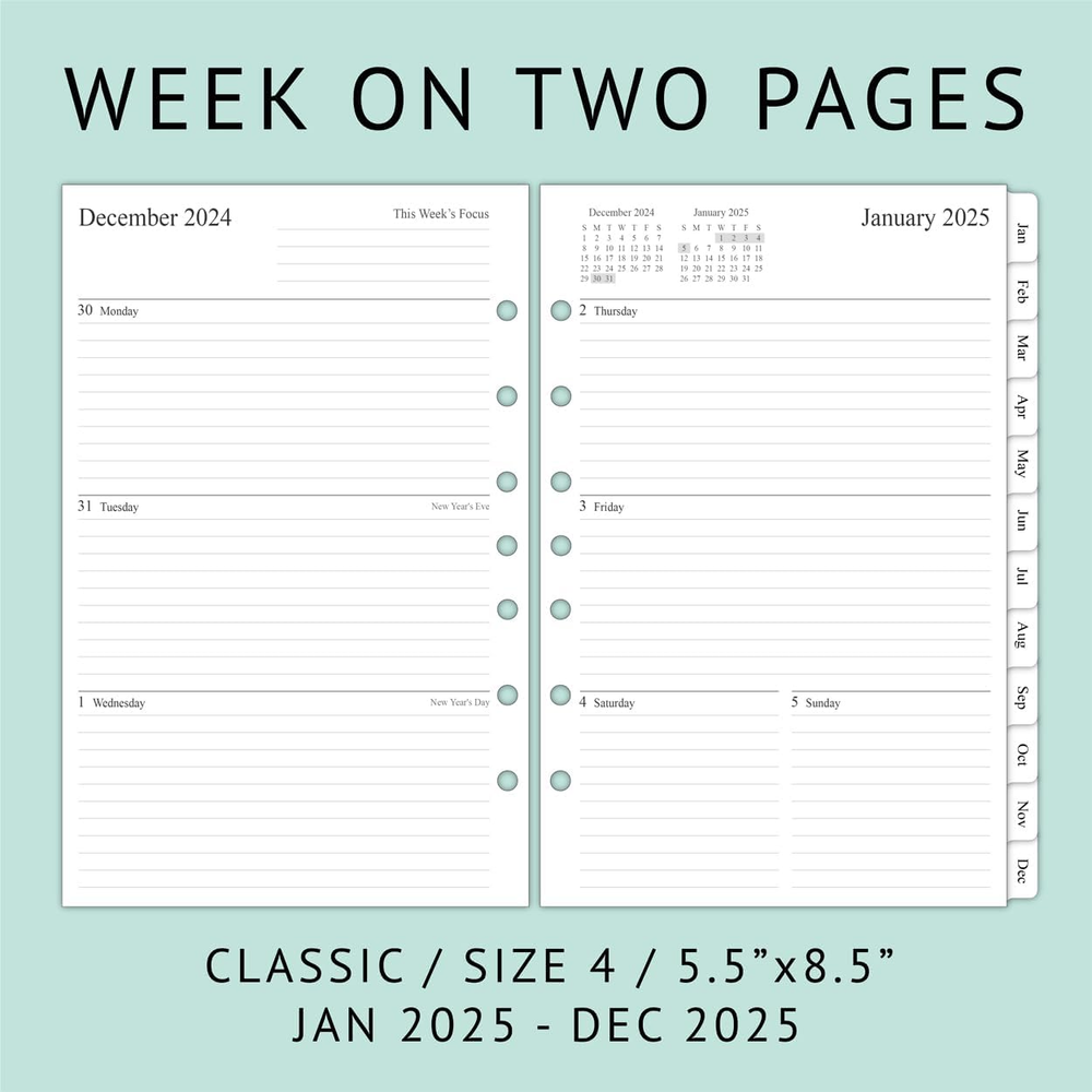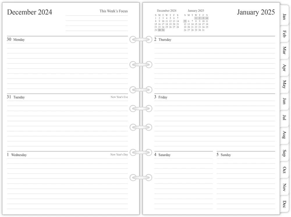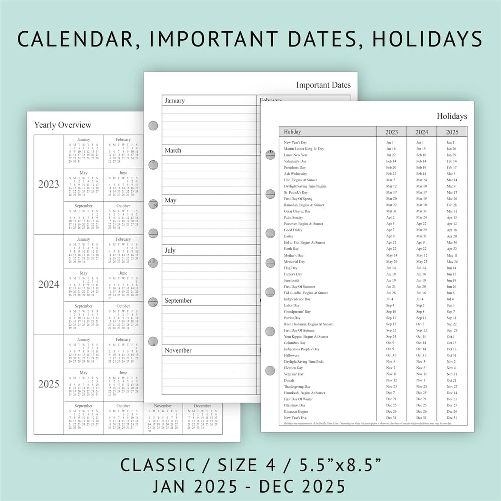 Store New Arrivals Add to Favorite View Feedback Contact Newestor 2025 Weekly & Monthly Planner Refill, 5-1/2" X 8-1/2", Runs from January 2025 to December 2025, Ruled Daily Blocks, Classic/Desk Size 4, 7-Hole Punched Description Item model number N19-R-A5-7 Manufacturer September Leather Sheet Size 5.5 X 8.5 Inches Calendar Type Weekly Format Day to Day Calendar Color White Binding Ring-bound Cover Material Paper Material Paper Material Type Paper Manufacturer Part Number N19-R-A5-7 Style Jan 2025 - Dec 2025 Item Weight 0.23 Kilograms Product Dimensions 8.27 x 6.1 x 0.39 inches Is Discontinued By Manufacturer No Target Audience Adult Brand newestor Size Classic (Size 4) - 5.5”x8.5“ 2025 planner refills 5.5"x8.5" for 3-Ring or 7-ring mini binders (half letter size), Jan 2025 to Dec 2025 2 page monthly spread with ruled daily blocks, calendar & notes section, laminated month tabs to allow quick turning Weekly spread includes Week's Focus & 2-month calendar sections on the top and a Monday to Sunday format Feature: 2-year calendar & hollidays pages, contact, yearly goals, important days, contacts, and notes pages, extra 3-month spread pages for early planning (Oct 2024 to Dec 2024, No Weekly Pages) Compatible with Day Timer (desk size 7-ring binder), Franklin Covey (classic 7-ring binder), Avery (3-ring mini binder) Product Description Refill your 3 ring or 7 ring mini binders (5.5"x8.5") and keep organized with this 2025 weekly planner refills that feature coated monthly tabs, yearly goals, important dates, holidays and notes pages. 2025 Weekly Planner Refills Compatible with below brands and similar 3-ring or 7-ring mini binders: AT-A-GLANCE, desk size Avery, mini binder Franklin Covey, classic PLANNING PAGES OVERVIEW ABOUT US We offer the best prices around on high quality products. Our E-store includes media such as books, movies, music and games while offering electronics, toys, sporting apparel, clothing, tools, general home, garden items and more. SHIPPING We are always working hard to ensure your package arrives as soon as possible. Please understand that some factors like weather, high postal traffic, and the performance of shipping companies are outside of our control. We offer free shipping to the lower 48 states and ship within 2 business days of payment, usually sooner. We do not accept P.O. Boxes. Please provide a physical address. RETURNS We offer a 30-Day Return Policy on items which you are not completely satisfied with. You have the option for a full-refund or an exchange of the item. No returns are available on items shipped outside of the USA. PAYMENT We accept PayPal. CONTACT US This page content is yet to come Please ad us to your favorite seller and visit again later Thank You CUSTOMER SATISFACTION We try our very best to make sure every customer is completely satisfied. If there's a problem, message us! We're happy to help.