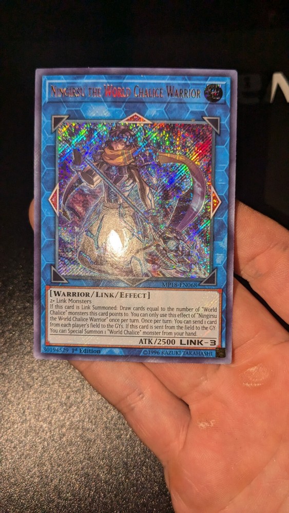 Enhance your Yu-Gi-Oh! TCG collection with the formidable Ningirsu the World Chalice Warrior from the 2018 Mega-Tins Mega Pack. As a Secret Rare card numbered MP18-EN068, it boasts an impressive 2500 attack power, perfect for tipping the scales in your favor during duels. This card, printed in English, features the Earth attribute and belongs to the Warrior creature/monster type, adhering to the game's strategic depth. Ningirsu comes as a 1st Edition Effect, Link monster type, adding a unique synergy to your deck. Manufactured by Konami, this card is a must-have for both players and collectors alike, offering a blend of tactical advantage and collectible value. Its inclusion in the 2018 Mega-Tins Mega Pack set marks it as a standout piece from that series.