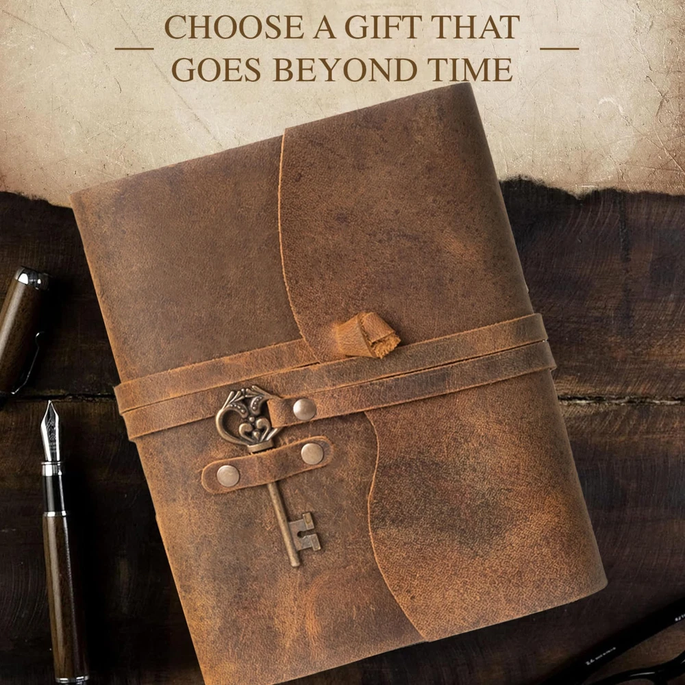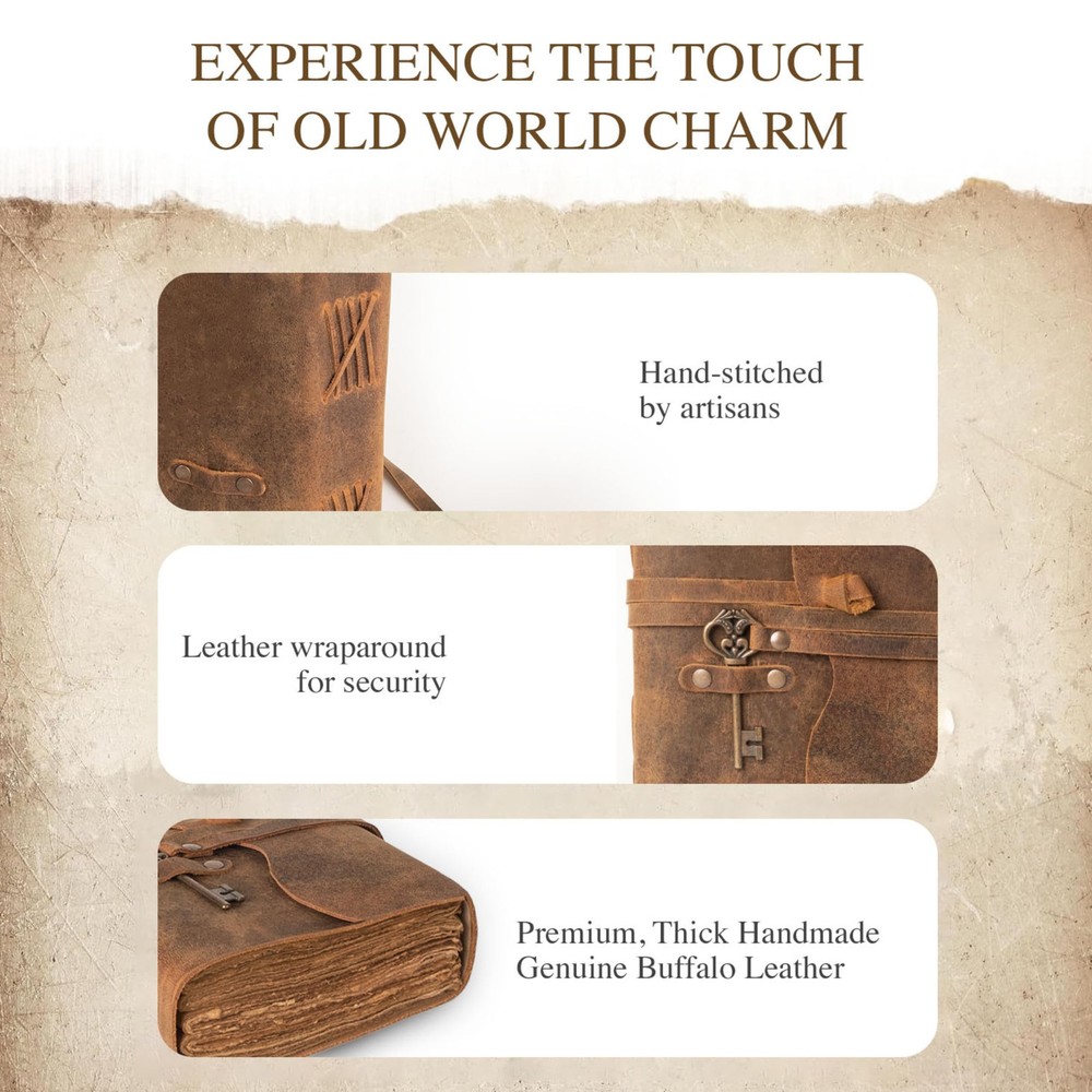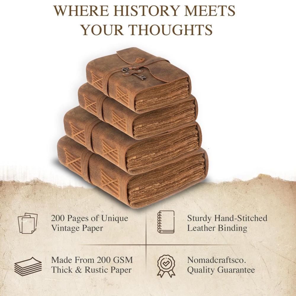 Discover the NomadCraftsCo. Leather Journal for Men and Women, a stunning vintage journal crafted with care, perfect for those who appreciate a cool journal experience; this leather diary is ideal for jotting down thoughts, creating a fantasy journal, or capturing memories in an old journal vintage style, reminiscent of the beloved Arthur Morgan journal; our vintage diary features a large leather journal design with a leatherbound notebook journal that is perfect for artists, as it doubles as a leather bound sketchbook for drawing; whether you’re into old stuff or simply need a reliable leather travel journal, this blank leather journal is your go-to choice; with its handmade paper journal pages, it’s the ultimate leatherbound journal for men and women alike, making it a perfect gift in its elegant gift box; elevate your writing experience with this exquisite leather journal, the perfect sketch book leather for all your creative endeavors! VINTAGE LEATHER JOURNAL WITH GIFT BOX: Preserve your memories in style with this vintage leather notebook journal, perfect for creating a unique junk journal book. Made from genuine buffalo leather, naturally tanned with oils and chrome-free, this cruelty-free leather journal features varying shades and textures, ensuring each piece is truly one of a kind. PREMIUM VINTAGE DECKLE PAPER: Enhance your creative journey with this leather-bound notebook featuring 200 pages (both sides) of 200 GSM thick virgin cotton handmade deckle edge paper. This handmade journal provides a perfect surface for both dry and wet mediums, making it an ideal choice for all your artistic and writing needs. VERSATILE VINTAGE NOTEBOOK: This leather-bound vintage notebook is perfect for all creative needs. Featuring handmade deckle edge paper from recycled cotton, it’s ideal for writing, watercolor, and more. Available in 4 sizes, it’s a timeless vintage diary. PERFECT GIFT: Presented in a beautiful gift box, this vintage-inspired old journal makes a timeless and thoughtful gift for anyone—women, men, teens, and even grandparents. Ideal for anniversaries, birthdays, graduations, or new adventures, it evokes the charm of old books. NOMADCRAFTSCO. PROMISE: Our leather journal notebook is a testament to exceptional craftsmanship and quality. Each unique journal is made with premium materials and careful attention to detail. Your satisfaction is our highest priority.