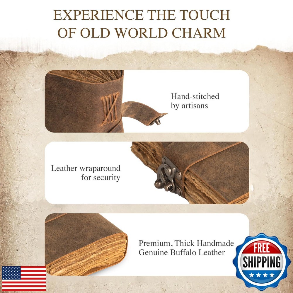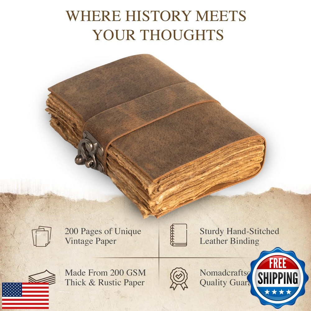 NomadCraftsCo. Vintage Leather Journal with Gift Box - Old Leather Bound Grimoire, Sketchbook, and Notebook - Perfect Leather Journals for Women and Men - Elegant Vintage Book for Writing and Drawing Features VINTAGE LEATHER JOURNAL WITH GIFT BOX : Capture memories in style with this vintage leather scrapbook, perfect for creating a unique junk journal book. This vintage journal is made from genuine buffalo leather, naturally tanned with oils and chrome-free. Each daily journal, crafted from cruelty-free leather, varies in look and shade, producing a truly unique item. LEATHER SKETCHBOOK WITH VINTAGE LOCK : This sketchbook combines elegance and functionality with a belt wrap-around closure and an antique brass lock, keeping your pages safe and secure. The hand-stitched binding is sturdy, ensuring that no paper comes loose, so you can sketch and journal with peace of mind. 200 GSM WATERCOLOR PAPER : Ideal for artists, writers, and vintage enthusiasts, this leather-bound journal is a must-have accessory. It features handmade deckle-edged paper crafted from recycled cotton waste, ensuring a no-bleed experience. This mixed media sketchbook is perfect for writing, watercolor, acrylics, pastels, and all dry and wet mediums. Use it as a sketch pad, watercolor sketchbook, and more THE PERFECT GIFT: This vintage-inspired journal makes an exquisite and timeless gift for a wide range of recipients, including women, men, teen girls, boys, and beloved grandparents. It’s an ideal present for anniversaries, birthdays, graduations, or for anyone embarking on a new adventure. Treat your loved ones to this charming keepsake. NOMADCRAFTSCO. GUARANTEE : Buy our vintage journal with confidence, thanks to our 100% satisfaction guarantee—if you're not happy, we'll refund your money. Enjoy the timeless charm of this beautifully crafted journal. Shipping Free & Fast Shipping: We offer free shipping to most of the USA with a normal delivery time of 3-7 days. However, due to the current situation, additional delivery time (up to 3 weeks) may be required for some items. Alternative Carriers: We may use alternative carriers (e.g., USPS, FedEx, UPS) to ensure your package arrives safely and on time. Due to the use of multiple carriers, we are unable to provide a tracking number automatically. Handling Time: Orders are processed and shipped within 1-2 business days of receiving cleared payment. Shipping Restrictions: Shipping to Alaska, Hawaii, Puerto Rico, Guam, and other US territories may incur shipping charges or delivery restrictions. Please contact us before ordering, or your order can be refunded/cancelled. State Restrictions: Certain items may not be shipped to California due to state regulations. Contact for Tracking Updates: If you require tracking updates or have any concerns about the delivery of your order, please feel free to contact us, and we will be happy to assist you. Return Policy 30-Day Hassle-Free Returns: If you are not completely satisfied with your purchase, you can return the item for free within 30 days of receiving it for a full refund or exchange. Easy Return Process: Contact us, and we will provide you with a prepaid return shipping label and detailed instructions. No Restocking Fee: There are no restocking fees for returns. However, the buyer is responsible for return shipping costs if the return is not due to a seller's error. Refund Processing: Refunds will be processed within 1 business day of receiving the returned item in its original condition. Payment We accept all major credit cards, PayPal, and Apple Pay for your convenience. Your payment information is secure and encrypted to ensure a safe and seamless transaction. Please complete your payment within 3 days of purchase to avoid any delays in shipping. Feedback Your feedback is extremely important to us. We strive to provide the best products and customer service possible. If you are satisfied with your purchase, please take a moment to leave us a positive review. If you have any concerns or issues with your order, please contact us before leaving negative feedback. We are committed to resolving any problems and ensuring your satisfaction. Contact Us If you have any questions or concerns, please feel free to reach out to our customer support team. You can contact us through the eBay messaging system. We are available Monday to Friday, 9:00 am to 5:00 pm EST, and we will do our best to respond to your inquiry within 24 hours. Thank you for supporting our small family business!