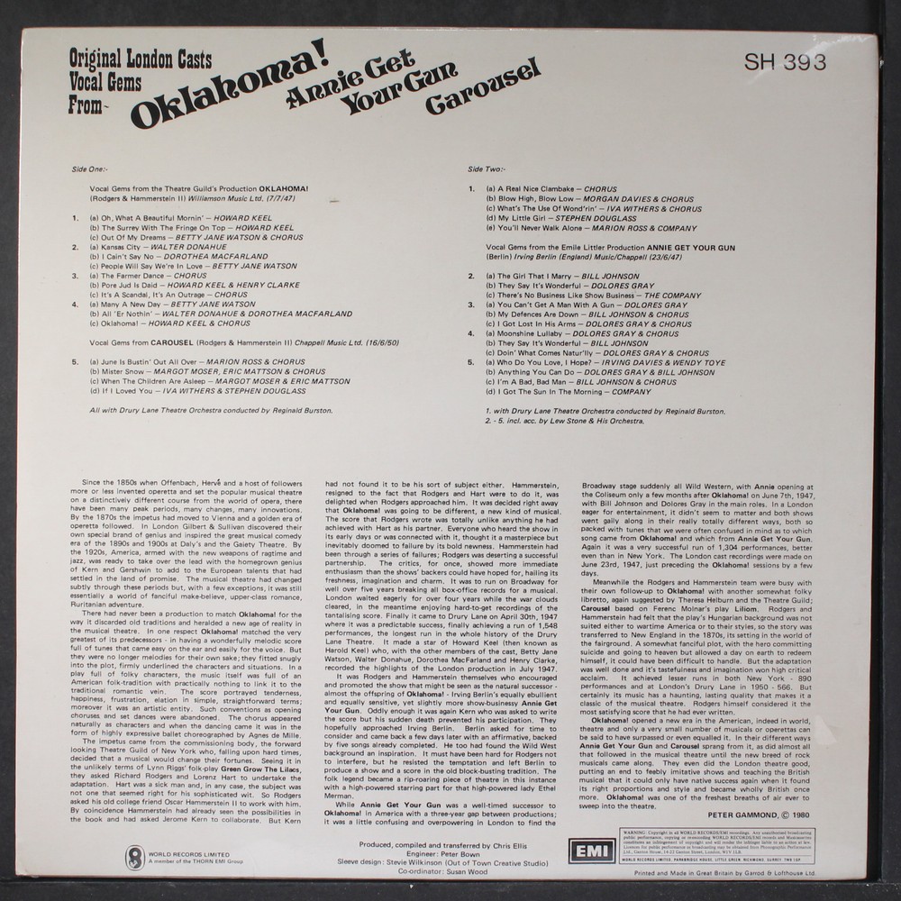 Item Details ORIGINAL LONDON CAST vocal gems from: oklahoma, annie get your gun & carousel Label: WORLD 393 Format: 12" LP (33 RPM) Item Condition: M- Genre: Soundtrack & Cast Notes: UK, import tag & small tear on cover, lite corner crease Price: $15 Shipping Info All orders are processed and shipped within 2 business days of receipt. We package and ship our vinyl records with the greatest care, using extra-thick packaging to ensure that your rare and collectible vinyl records arrive in pristine condition. Domestic Shipments USPS Priority Mail LP Only Shipments $15 for 1st LP + $2 each additional LP 45s, CDs and Cassettes $10.00 for 1st + $1 each additional Mixed Shipments $15 for 1st LP + $2 each additional LP / $1 each additional 45/CD/Cassette Oversized CDs, Cassettes, & 45s $14 base rate for 1st / $1 base rate each additional oversized + $1 each 45/CD/Cassette USPS Media Mail LP Only Shipments $7 for 1st LP + $1 each additional LP Mixed Shipments $7 for 1st LP + $1 each additional Oversized CDs, Cassettes, & 45s $6 base rate for 1st + $1 each 45/CD/Cassette Note: All domestic shipments are insured. International Shipments Air Mail LP Only Shipments $20 for 1st LP + $5 each additional LP 45 Only Shipments $18 for 1st 45 + $1 each additional 45 Mixed Shipments $20 for 1st LP + $5 each additional LP / $1 each additional Oversized CDs, Cassettes, & 45s $19 base rate for 1st / $1 each additional oversized + $1 each 45/CD/Cassette Note: Double LPs, box sets, etc. will incur additional shipping costs as indicated above. Record Grading Grade Explanation SS Still Sealed In factory-fresh condition. M Mint We don't use this grade. M- Mint Minus A near perfect, probably unplayed record. VG+ Very Good Plus Close to like new with only superficial signs of use that don't affect play. Only well cared for records will grade out to VG+. Will satisfy all but the most demanding collector. VG Very Good A used, reasonable copy. There will be obvious signs of wear and the possibility of light surface noise between tracks or during quiet passages, but still quite nice. VG- Very Good Minus Significant wear and marks and usually quite noticeable surface noise. G+ Good Plus In the record world, 'Good' is not good! From here on down (Fair, Poor), we're talking about beat-up records. * Unless noted, every record is an original issue for the label and catalog number. About Us Records By Mail offers one of the most comprehensive selections of vinyl LPs and 45s available anywhere. Housed in an 8,000 square foot warehouse that currently holds over 2 million records, Craig and his talented, dedicated staff serve music lovers in more than 60 countries. Records by Mail prides itself on maintaining one of the largest selections of rare vinyl records available anywhere—online or off. We are always looking to improve the quality of our service, and we update our database every day, so expect new titles and improvements with alarming frequency. Browse Categories Rock & Pop Soul Blues & R&B Oldies Jazz Funk Vocal Groups Rockabilly Country Vocalists Brazilian Punk/New Wave Easy Listening Soundtracks Reggae Black Gospel Rap/Hip-Hop Latin Our Guarantee We guarantee every item we sell to be as listed. We endeavor to provide superior service, but if we make an error, we'll make every effort to make it right either by refunding all costs involved, or adjusting the selling price to everyone's satisfaction.