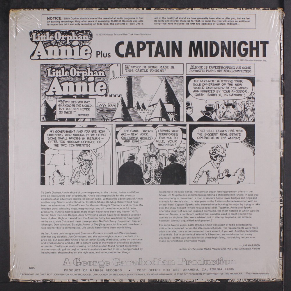 Item Details ORIGINAL RADIO BROADCAST little orphan annie, vol. 2 Label: MARK 56 685 Format: 12" LP (33 RPM) Item Condition: Still Sealed Genre: Spoken Word Price: $20 Shipping Info All orders are processed and shipped within 2 business days of receipt. We package and ship our vinyl records with the greatest care, using extra-thick packaging to ensure that your rare and collectible vinyl records arrive in pristine condition. Domestic Shipments USPS Priority Mail LP Only Shipments $15 for 1st LP + $2 each additional LP 45s, CDs and Cassettes $10.00 for 1st + $1 each additional Mixed Shipments $15 for 1st LP + $2 each additional LP / $1 each additional 45/CD/Cassette Oversized CDs, Cassettes, & 45s $14 base rate for 1st / $1 base rate each additional oversized + $1 each 45/CD/Cassette USPS Media Mail LP Only Shipments $7 for 1st LP + $1 each additional LP Mixed Shipments $7 for 1st LP + $1 each additional Oversized CDs, Cassettes, & 45s $6 base rate for 1st + $1 each 45/CD/Cassette Note: All domestic shipments are insured. International Shipments Air Mail LP Only Shipments $20 for 1st LP + $5 each additional LP 45 Only Shipments $18 for 1st 45 + $1 each additional 45 Mixed Shipments $20 for 1st LP + $5 each additional LP / $1 each additional Oversized CDs, Cassettes, & 45s $19 base rate for 1st / $1 each additional oversized + $1 each 45/CD/Cassette Note: Double LPs, box sets, etc. will incur additional shipping costs as indicated above. Record Grading Grade Explanation SS Still Sealed In factory-fresh condition. M Mint We don't use this grade. M- Mint Minus A near perfect, probably unplayed record. VG+ Very Good Plus Close to like new with only superficial signs of use that don't affect play. Only well cared for records will grade out to VG+. Will satisfy all but the most demanding collector. VG Very Good A used, reasonable copy. There will be obvious signs of wear and the possibility of light surface noise between tracks or during quiet passages, but still quite nice. VG- Very Good Minus Significant wear and marks and usually quite noticeable surface noise. G+ Good Plus In the record world, 'Good' is not good! From here on down (Fair, Poor), we're talking about beat-up records. * Unless noted, every record is an original issue for the label and catalog number. About Us Records By Mail offers one of the most comprehensive selections of vinyl LPs and 45s available anywhere. Housed in an 8,000 square foot warehouse that currently holds over 2 million records, Craig and his talented, dedicated staff serve music lovers in more than 60 countries. Records by Mail prides itself on maintaining one of the largest selections of rare vinyl records available anywhere—online or off. We are always looking to improve the quality of our service, and we update our database every day, so expect new titles and improvements with alarming frequency. Browse Categories Rock & Pop Soul Blues & R&B Oldies Jazz Funk Vocal Groups Rockabilly Country Vocalists Brazilian Punk/New Wave Easy Listening Soundtracks Reggae Black Gospel Rap/Hip-Hop Latin Our Guarantee We guarantee every item we sell to be as listed. We endeavor to provide superior service, but if we make an error, we'll make every effort to make it right either by refunding all costs involved, or adjusting the selling price to everyone's satisfaction.