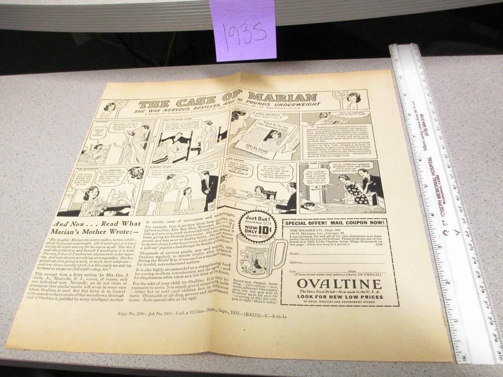 ITEM DESCRIPTION OVALTINE PROOF 1935 mag news ad blank back LITTLE ORPHAN ANNIE premium MARIAN $18.00 This item comes from the Ovaltine Archives-- read the story below. You can use a printout of this EBAY listing as your COA (Certificate of Authenticity) ! My Internal Inventory Code : PROOFS 2013 CONDITION OF ENTIRE COLLECTION : A General Statement One must realize that due to the nature of how the Wander Company handled their Ovaltine Archives, the method of storage and handling was not with picky collectors like you and me in mind. Items may be folded, written on in ink or pencil (with notations, messages, personal notes or filing codes), stapled, taped, cut unevenly (in the case of pages from print media), punched with binder holes....... and a LOT of the items in binders were glued to black construction paper pages. Fortunately whatever glue they used frequently has deteriorated and allowed items to fall off the pages without tearing or paper loss. However, keep in mind that such items carry brown brush stroked glue stains on part of their surface which I attempt to show in most cases. In cases of certain binders being sold in their entirety, to be safe, assume most items have glue stains on the back unless otherwise specified . ================================================================== ITEM FOR SALE IN THIS LISTING : an advertising proof which is BLANK on the reverse side; this is NOT cut out from a magazine; this was used within the industry and are very rare ; Proofs are also usually higher quality color and clarity than the ad when it appeared in a mass published periodical; considering the rarity these are a reasonable price for what they are SIZE (see ruler or yardstick in the photo) CONDITION OF ITEM IN THIS LISTING : displays fine to excellent, may have some brown glue marks on the reverse where it was once glued onto a page in a binder, possible a few small creases and minor tears =================================================================== Click here to see all my listings on EBAY from The Ovaltine Archives ! =================================================================== THE OVALTINE ARCHIVES In Feb and Mar 2012, I purchased what I am calling "The Ovaltine Archives". Ovaltine was a product of the Wander Company and they originally had their offices in Illinois when they started in the 1920s. They were located for decades in Chicago and Villa Park, IL and the return address on many classic premiums for Little Orphan Annie and Captain Midnight carried those same return addresses. Some time in the 1980s they appear to have moved to Minneapolis MN, due possibly due to having been purchased by a larger company. In present day, Ovaltine is owned by Nestle who also now has one of their offices in Minneapolis MN. In 2012, I purchased a large amount of Ovaltine related material from an individual who had worked for Nestle in Minneapolis at the time the items were being discarded. At some point in 2007-2010 , orders came down from "higher up" that the enormous Ovaltine Company archives on premises were to be gotten rid of by a certain time. The storage where they were located was emptied and everything was put on 2 pallets about 6 feet high. Employees of that office were instructed they could take whatever they wanted for free, since the items were headed for the garbage. After a week or so, whatever was not taken by employees was disposed of and unfortunately, A LOT of the material was not saved. No one knows for sure what was in the boxes that were thrown away but I can tell you that from what remains, the Ovaltine people were fanatical record keepers and appear to have saved EVERYTHING. The remaining material, The Ovaltine Archives, contained 99% paper items such as..................... 40+ binders and books with such items as : 2 binders that track the sales results of every Little Orphan Annie premium from 1930-1938, 9 binders that show examples of ads run in magazines for years 1930-1937, salesman pitch books for 1950s Capt Midnight promotions, a small amount of original art, 2 binders that contain an example of every company envelope Ovaltine used from the 1930s-1950s, TV commercial storyboards from the Leo Burnett Company, proof copies of advertisements, Capt Midnight TV & Radio ratings results, 4 books of advertising analysis, 1 book documenting Ovaltine ads connected with the Dave Garroway TV show, a couple binders which contain a small amount of material on Howdy Doody promotions around 1950, 6 binders of 1955-1956 Capt Midnight related company correspondences with their ad agency Tatham-Laird, 3 binders of 1955-1956 Capt Midnight related letters to consumers with Capt Midnight letterhead and his picture, 12 binders documenting print ads for years 1927,1930-1939, 1943 ; 3 binders of proof copies of print ads for years 1947, 1948 and 1950 Advertising and Misc.items include : advertising blotters, TV station pitch books, CBS TV merchandising kit for the Capt Midnight TV show with film commercials and newspaper ad mats, several dozen 1950s Capt Midnight store signs, posters, salesman brochures and misc advertising, a small assortment of Ovaltine related archive photos, 1973 cereal boxes with PDQ offers, some misc LOA and Capt Midnight premiums, LP records with radio & TV commercials on them, numerous 16mm and 35mm films, and a large sampling of in store advertising materials such as large bin signs, posters, banners, window signs, jar labels, shelf talkers, coupons, jar collars, product holders, brochures, flyers, and more ! There is not a lot of duplication. It is rare there is more than 2 of anything which makes me think that possibly they tried to save 2 of everything but in some cases, a small handful of items had quantity of 5 or 10. Admittedly, a significant portion of the Ovaltine Archive material is only going to be of interest to die hard food, radio and premium collectors. However the information contained in some of these papers reveals amazing 