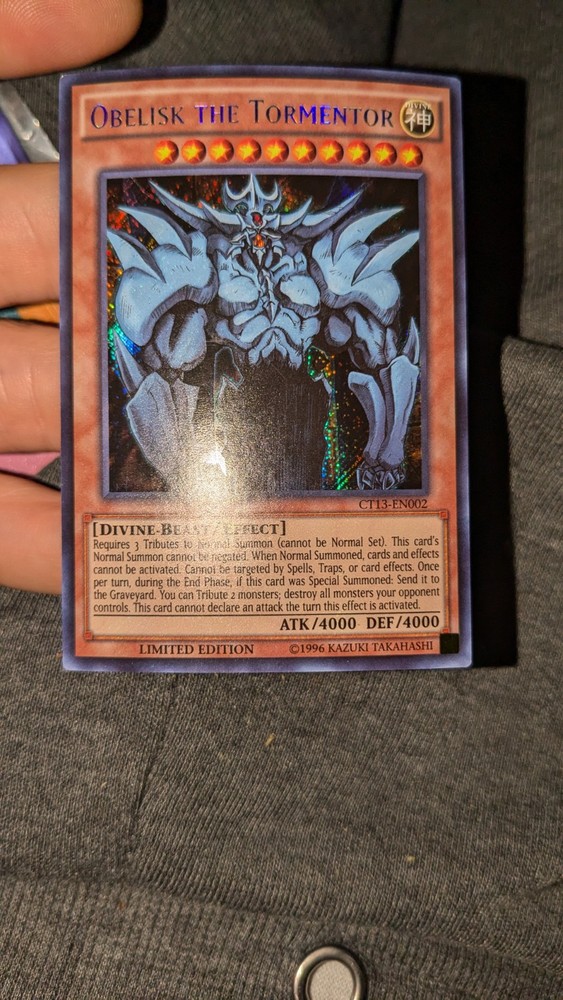 This rare and powerful Yu-Gi-Oh! TCG card features the Divine-Beast creature type and is from the 2016 Mega-Tins set. With an attack and defense of 4000, Obelisk the Tormentor is a formidable addition to any deck. This limited edition card is secret rare and has the card number CT13-EN002. Manufactured by Konami and written in English, this card is perfect for any collector or player looking to enhance their game.