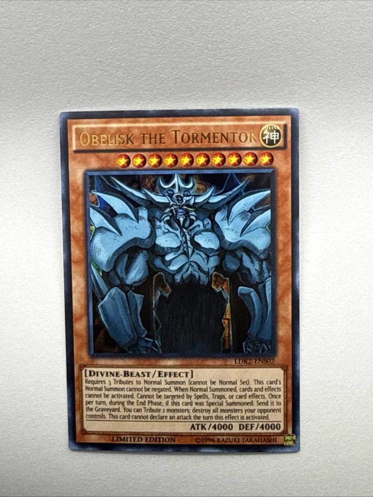 Elevate your Yu-Gi-Oh! TCG collection with the formidable Obelisk the Tormentor from the Legendary Decks II set. This Ultra Rare Divine-Beast card, with its impressive 4000 attack and defense, can be a game-changer in your duels. Featuring the unique card number LDK2-ENS02, it's a must-have for both serious collectors and competitive players. Crafted by Konami, the card is presented in English and showcases the prestige of a Limited Edition release. Obelisk the Tormentor not only stands out in its majestic artwork but also brings a significant edge to your gameplay, making it a worthy addition to any deck or display.