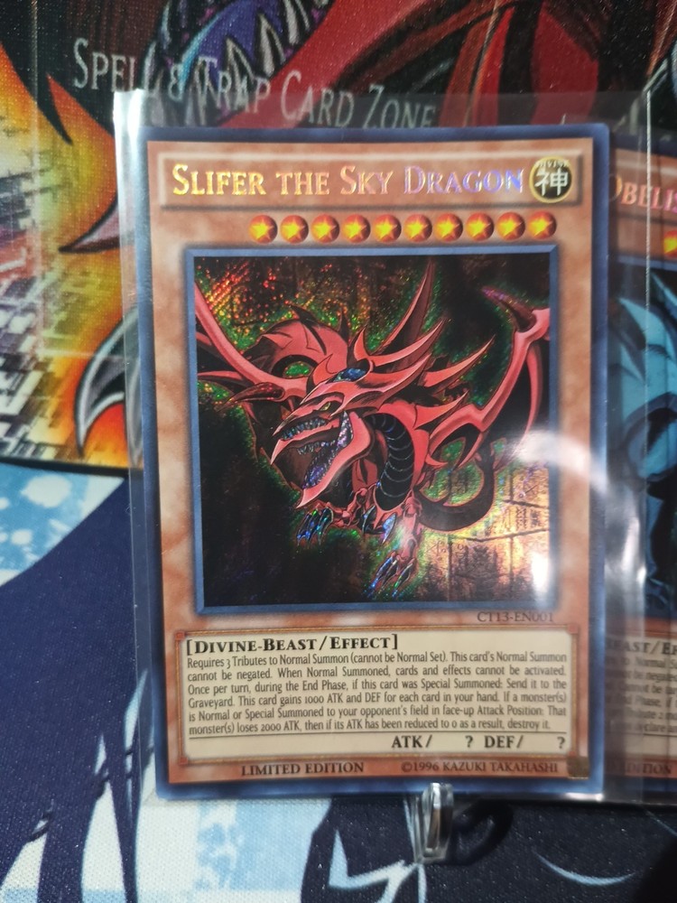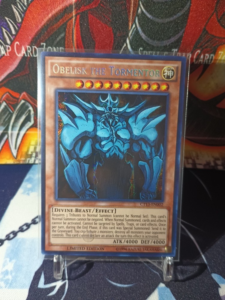 Unleash the power of Egyptian God Cards with Obelisk the Tormentor and Slifer the Sky Dragon, both in Secret Rare Limited Editions. These iconic Divine-Beast cards from the 2016 Mega-Tins set, CT13-EN002, boast an attack and defense of 4000, making them formidable additions to any Yu-Gi-Oh! collection. With a Holo finish that enhances their stunning artwork, these Effect type cards are a must-have for both players and collectors. Produced by Konami and printed in English on Japanese card stock, they are suitable for ages 6 and up. Don't miss the chance to own these legendary cards and give your deck the edge it needs to dominate the duel.