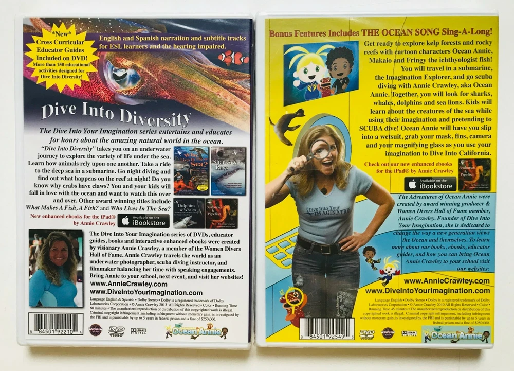 Dive into Diversity & Dive into California Ocean Annie 2 DVD set Annie Crawley Picture is actual item Free shipping on this item. Ships to arrive in 3-5 business days after payment. Or choose Priority shipping for $7.00 to arrive in 2-3 days Please feel free to contact us with any questions! Terms of Sale Our goal is to create happy buyers. Get a great item and feel good about it! We do make best efforts to note conditions for all items. Please look at the pictures carefully. Please contact us with any concerns about condition before bidding or purchasing and we will happily respond. If any images or descriptions are not clear we are happy to clarify. We are willing to work with you if you are dissatisfied with your item’s condition. Please contact us right away and we will work it out. We want all our customers to feel the desire to rush and leave glowing feedback and we want to do the same. Payment Payment within 3 days of auction ending or at time of purchase made. Shipping We ship inside the United States primarily. We will ship International for some Items using eBay Global Shipping Program. Offers of free shipping do not apply to International orders. Please contact us before bidding if you are an international buyer and have questions about the product or how it will ship. All items are packaged carefully and shipped primarily via USPS unless alternate shipping is requested and arranged before you bid. Larger items my ship by FedEx or other carrier. Please note that shipping times can vary but we do our best to balance cost and speed to continue giving you the best deal possible . Thank you for shopping with us!