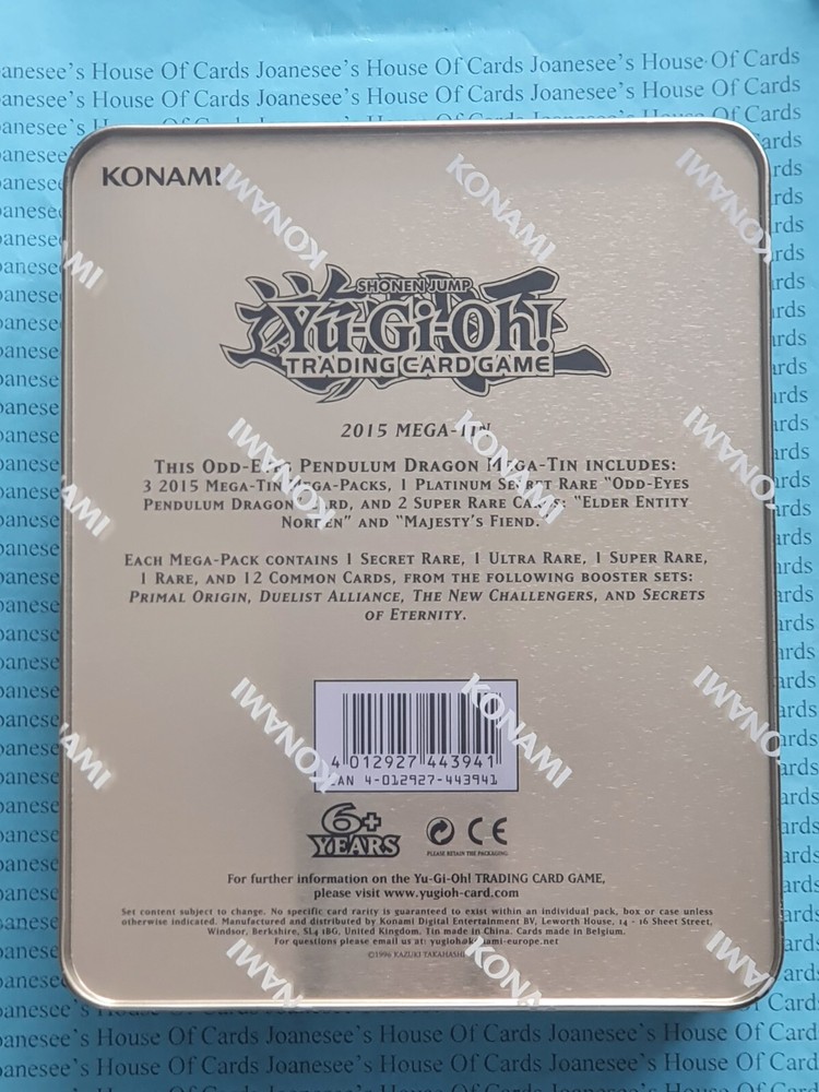 This is the 2015 Mega-Tin - Odd-Eyes Pendulum Dragon Every tin contains three 16-card Mega Packs as well as three promotional cards: The "Odd-Eyes Pendulum Dragon" Tin contains: 1 Platinum Secret Rare promotional card 2 Super Rare promotional cards CT12-EN001 "Odd-Eyes Pendulum Dragon" Platinum Secret Rare CT12-EN003 "Elder Entity Norden" Super Rare CT12-EN004 "Majesty's Fiend" Super Rare 1st Edition/Limited Edition English (EU Version) Mint/NMint Condition Totally Original Konami (or your money back!) I will deliver in safe packaging to keep it in perfect condition. Ideal for players and collectors alike. Check out my other items! I will combine postage costs for multiple purchases. Sign up for my email newsletters by adding my eBay Shop to your favourites