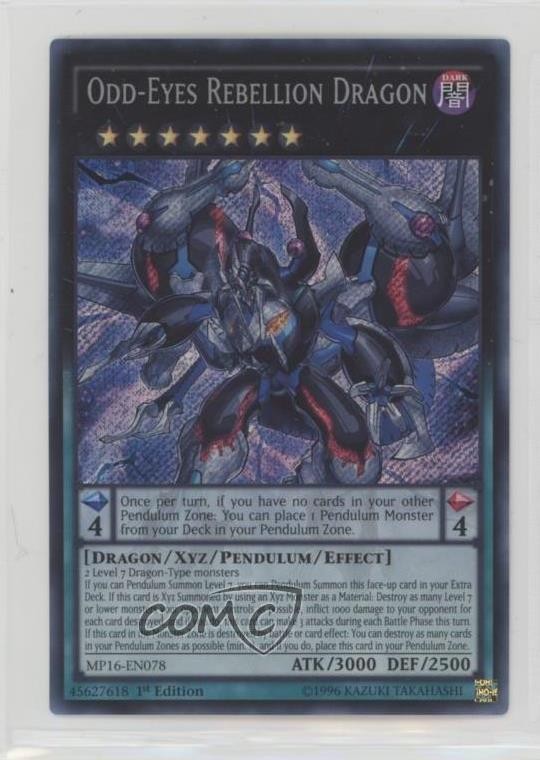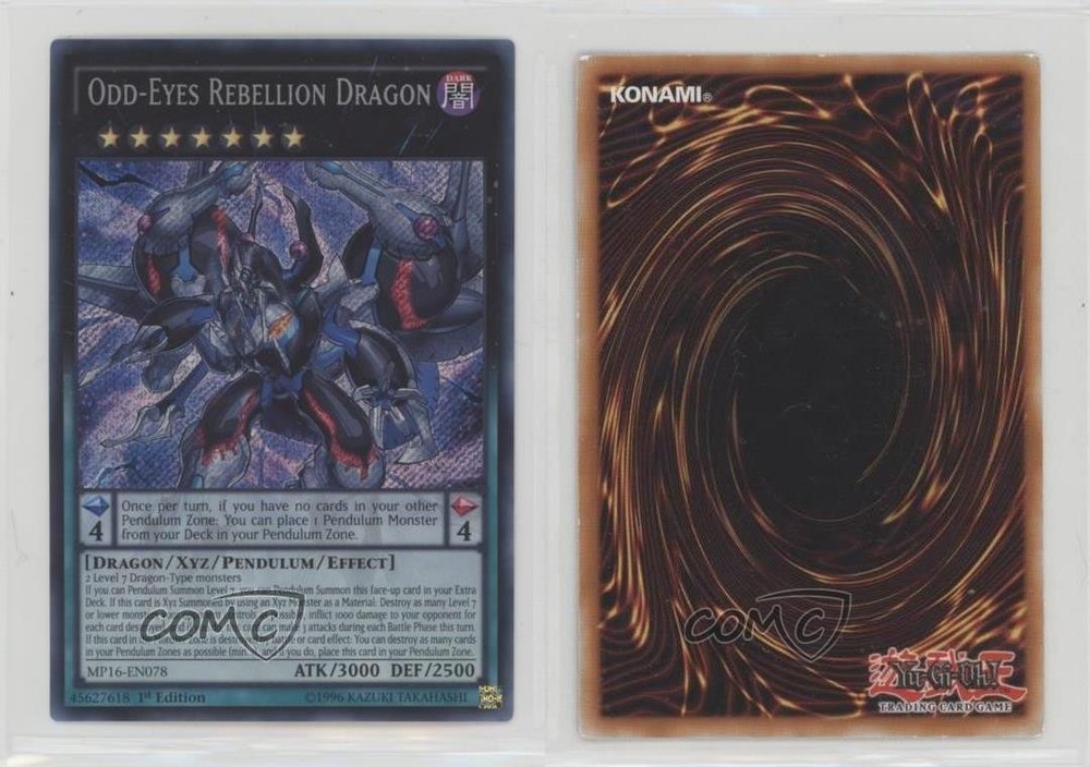 2016 Yu-Gi-Oh! Mega-Tin - Mega Pack [Base] - 1st Edition #MP16-EN078 Odd-Eyes Rebellion Dragon (SE) COMC Item: 243035116 - YuGiOh Card - Featuring Odd-Eyes Rebellion Dragon Search for more: 2016 Yu-Gi-Oh! Mega-Tin Search for more: 2016 Yu-Gi-Oh! Mega-Tin - Mega Pack [Base] - 1st Edition View all of our Listings Auctions Buy It Now About Us Located in the beautiful Pacific Northwest, COMC (Check Out My Cards) is the world's largest consignment service for trading card singles. More than 10,000 people have used our consignment service to list over 50 million trading cards. Find out how we can help you consign your items on eBay by contacting us through eBay messaging. COMC -- "The Safe & Easy Way to Buy & Sell" Raw Condition for Modern Cards Unless otherwise noted, raw modern cards are listed in Near Mint-Mint condition or better. A NM-MT card appears to be Mint at first glance, but upon closer inspection, may exhibit some of the following: minor print defects (e.g. roller marks, print line, dimple), minor scratches, slight edge wear, and slight corner wear. Centering is clearly visible in the images provided and does not factor into our condition assessment. Raw Condition for Vintage Cards Unless otherwise noted, raw vintage cards are listed in Excellent condition or better. An EX card may exhibit some of the following: minor rounding of corners, surface wear, print defects, light scratches, and slight edge wear/chipping. Centering is clearly visible in the images provided and does not factor into our condition assessment. Domestic Shipping Combined shipping for multiple items is available. To receive combined shipping, please ensure all desired items are in your eBay shopping cart before proceeding to checkout. eBay limits orders to 40 items per order. We automatically combine multiple orders placed on the same day. If you place multiple orders on the same day, please contact us to request a refund of applicable shipping costs. Signature confirmation may be required on invoices over $400. All cards are protected and shipped securely. International Shipping COMC offers eBay's International Shipping (EIS) for international orders under $2,500* (see country exceptions below). All duties and import fees are paid at checkout; in the rare event that there are additional import fees upon delivery, these are borne by the buyer. EIS packages route through a shipping hub in Erlanger, KY before shipping to their final destination. Please note that EIS does not allow for combined shipments. The shipping rates are determined by eBay and cannot be adjusted. *Maximum sale price exceptions: Colombia, Kuwait ($2,000); Taiwan ($1,539); Chile, Costa Rica, Guatemala, Honduras, Trinidad and Tobago ($1,000); Antigua and Barbuda, Aruba, Belize, Dominica, Grenada, Philippines, Saint Kitts and Nevis, Saint Lucia, Montserrat, Turks and Caicos Islands ($500); Dominican Republic, El Salvador ($200). Please request a shipping quote through eBay messaging for orders that exceed the maximum sale price supported by eBay's International Shipping. You will be responsible for all duties and import fees for international orders shipped outside the EIS. All cards are protected and shipped securely. Payment COMC does not accept offers on our cards through our eBay storefront. COMC utilizes eBay’s managed payments system. If you are experiencing difficulties making a payment, please contact eBay for assistance. Return Policy Returns are only accepted on the rare occasion the item is not as described. If you are making a return, please initiate the return process through eBay so a mailing label can be provided for you. Prior to listing, our expert team carefully assessed this item to represent it accurately. Please review the description and high-definition images prior to purchasing to ensure this item meets your satisfaction. We welcome you to contact us if you have further questions about this item. Trust and Integrity COMC carefully assesses each item consigned to us to prevent fraudulent items from entering the marketplace. If you believe an item offered on COMC may be fraudulent, please contact us with details so we can investigate the issue. Items we determine are outside our supported items policy may be removed. Last Modified: 6/3/2025 4:48:11 AM PDT