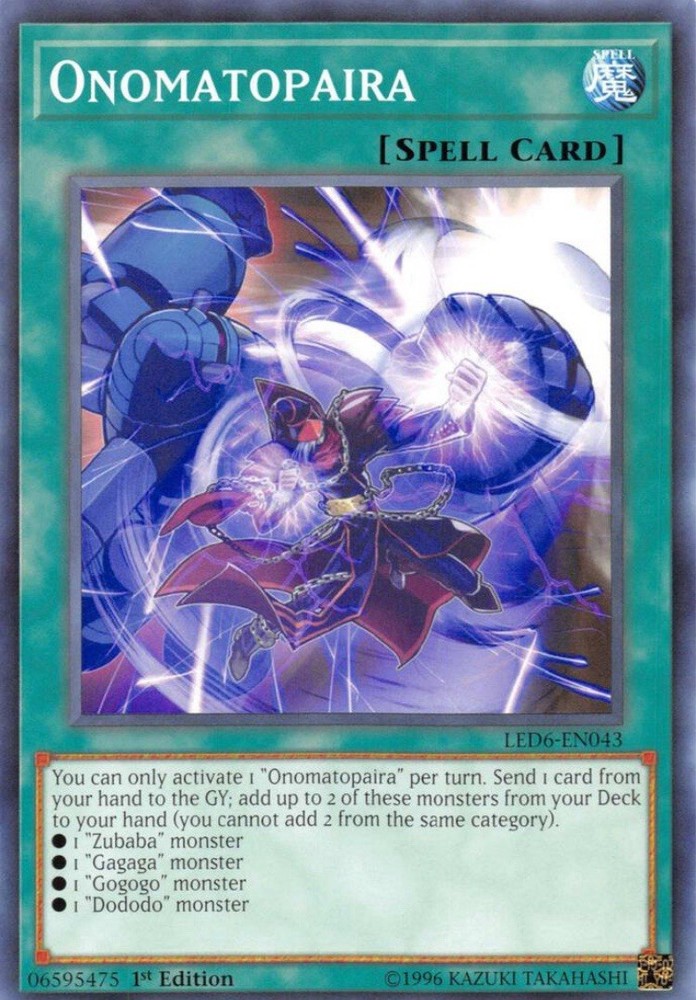 The product is a Yu-Gi-Oh! TCG card from the set Legendary Duelists: Magical Hero. It is a common/short print 1st edition English language card named Onomatopaira, manufactured by Konami. This card belongs to the Spell-Normal card type and has the card number LED6-EN043. It is ideal for fans and collectors looking to add a unique and rare card to their collection from the Yu-Gi-Oh! trading card game.