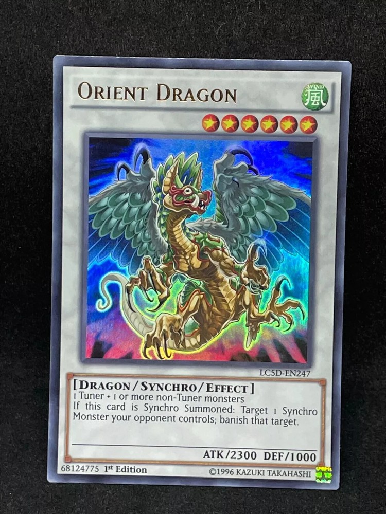 Welcome to our store We want to make sure customers are happy with their purchase , please be sure to carefully look at the state of the card in the pictures or reach out and ask additional information/ photos of any cards that you're interested in. We strive on happy consumers and giving satisfactory customer service. The cards vary from moderately played to near mint with a majority being in the lightly played area. Please do not hesitate to ask questions. Shipping All cards are shipped in a sleeve and top loader , between 2 sheets of cardboards held with rubber bands and in a bubble envelope mailer to assure protection from damage. If a much larger amount of cards is purchased we ship your purchase in a box fitting to the amount with bubble wrap/tissue paper for protection. Elevate your Yu-Gi-Oh! TCG collection with the majestic Orient Dragon, from the highly sought-after Legendary Collection 5D's. As a Synchro monster with Effect capabilities, this card is a formidable addition to any deck, boasting an attack power of 2300 and a defense strength of 1000. The Orient Dragon LC5D-EN247 carries the prestige of being a 1st Edition Ultra Rare card, a must-have for collectors and competitive players alike. With its unique Wind attribute and English language, it stands as a testament to Konami's rich gaming legacy. Add this iconic Synchro Dragon to your arsenal and watch your opponents marvel at the might of its wings.