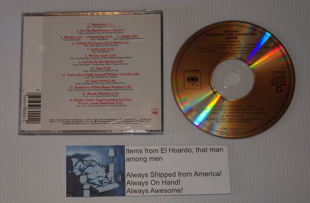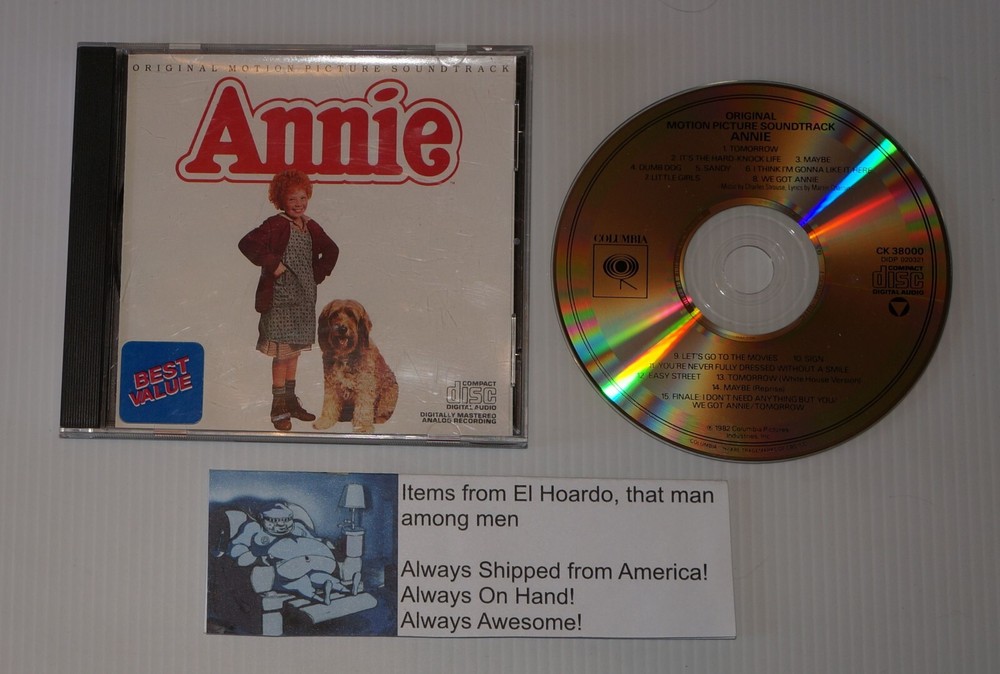 Hello everyone and welcome! El Hoardo here and I'm listing even more of those interesting items that I come across on my many travels. Up for sale today is a Very Good Condition copy of Annie The Soundtrack for the Musical movie from the early 80s. The disc is just waiting for a new owner to give it some love. Also check out my other listings for even more interesting and fun items. Have any questions? Please don't hesitate to ask. I try to answer all questions within 24 hours.