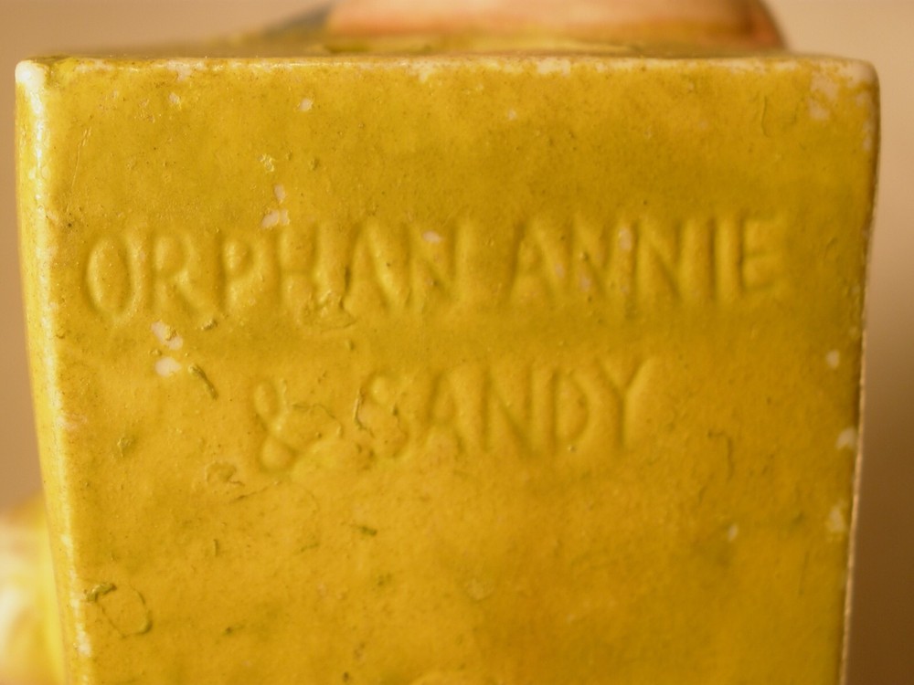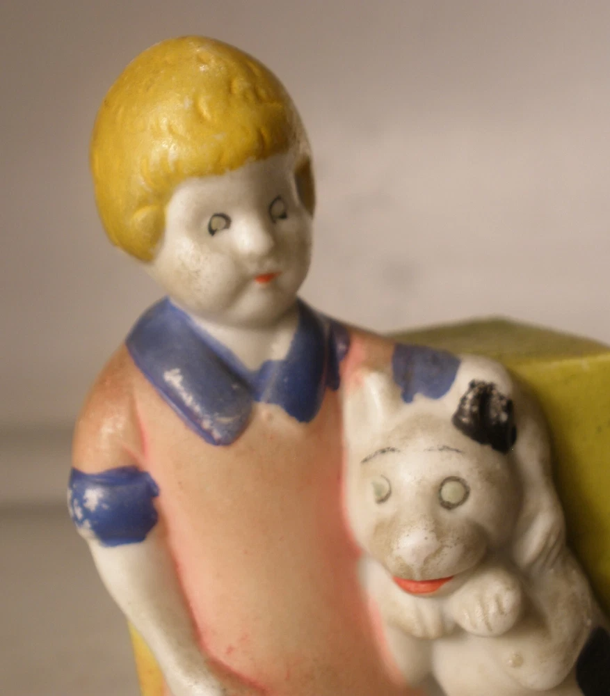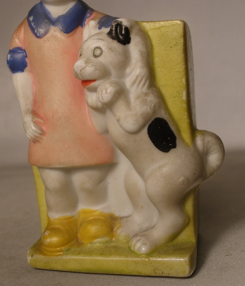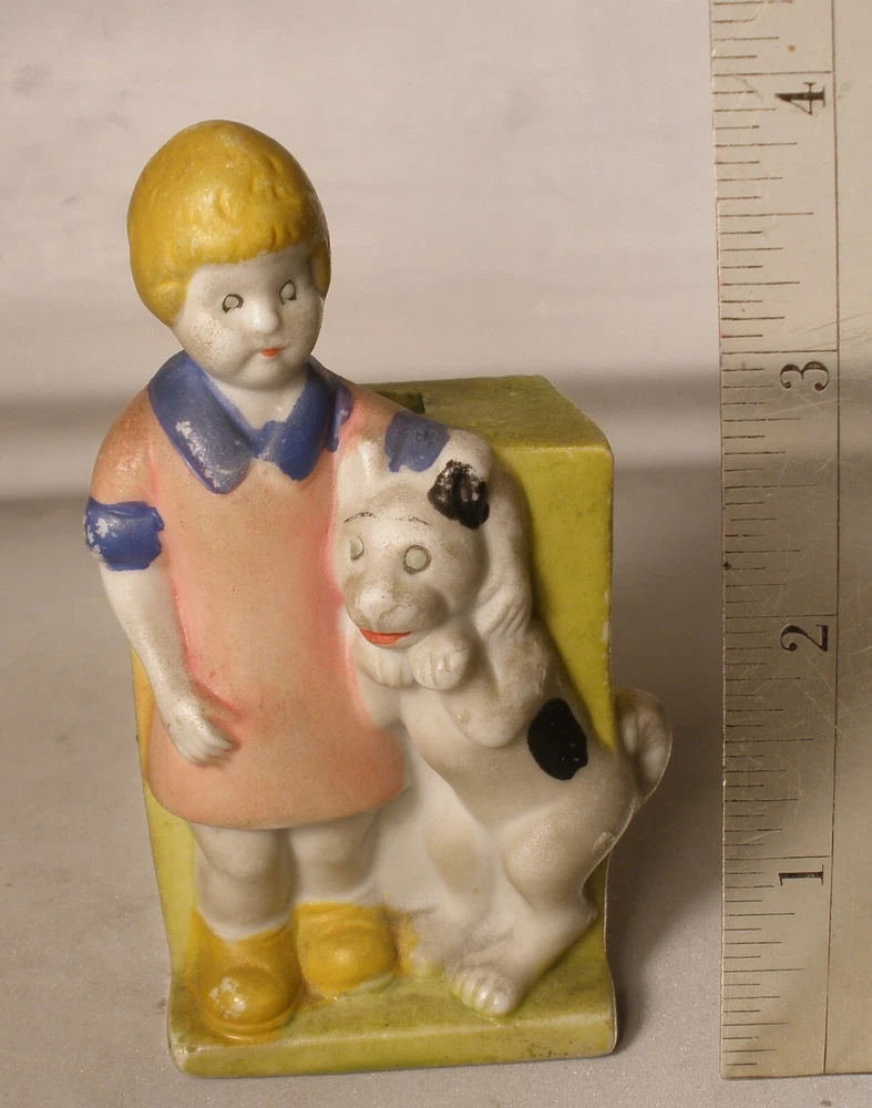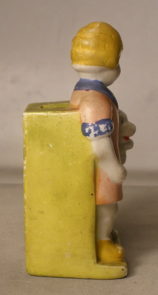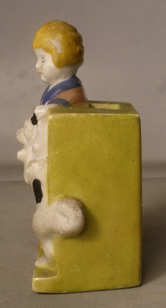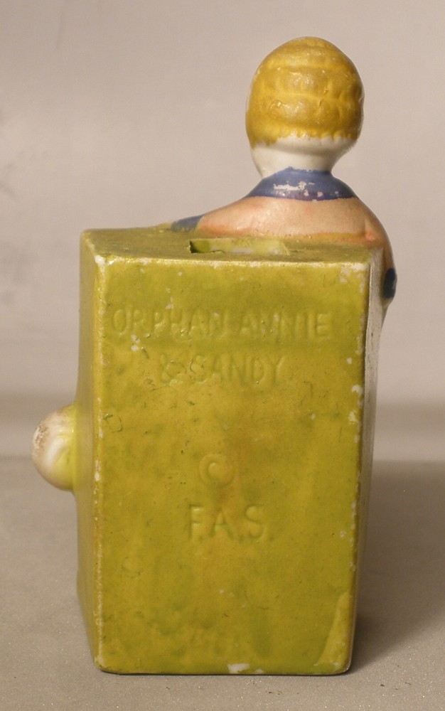 Orphan Annie and Sandy Porcelain Toothbrush Holder, 4 inches high, marked on bottom “Japan”, incised on back “Orphan Annie & Sandy, © F.A.S., S1565”, some soiling on the bisque, some wear to the paint, paint chipped along the lower edge on the back, hand painted details with some overlap, square cut into the bisque of the ledge behind Little Orphan Annie for holding the toothbrush, cute comic figurine. US shipping via USPS Ground Advantage . International shipments are via eBay International. Description is as accurate as possible. Any questions, please feel free to ask.