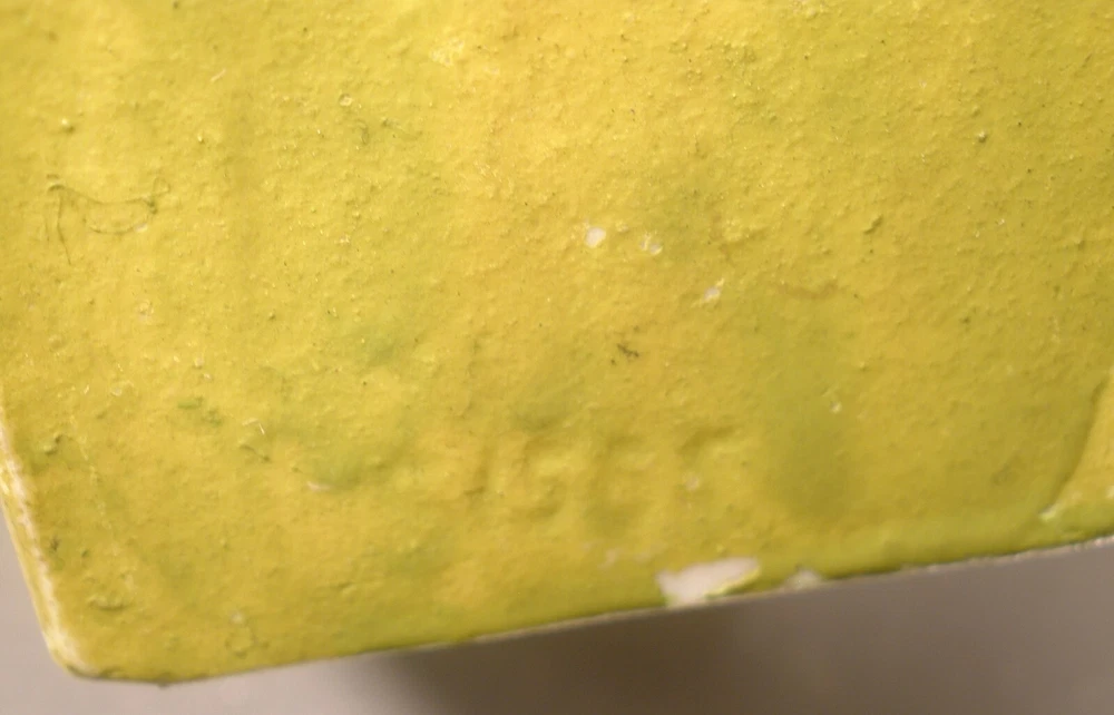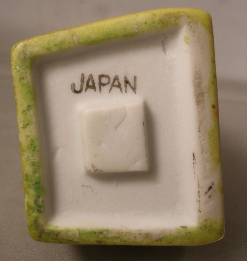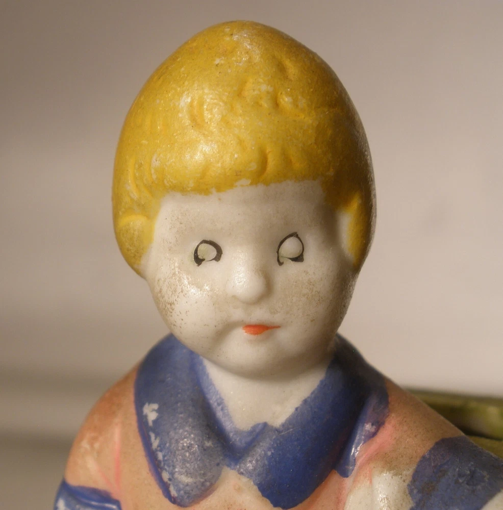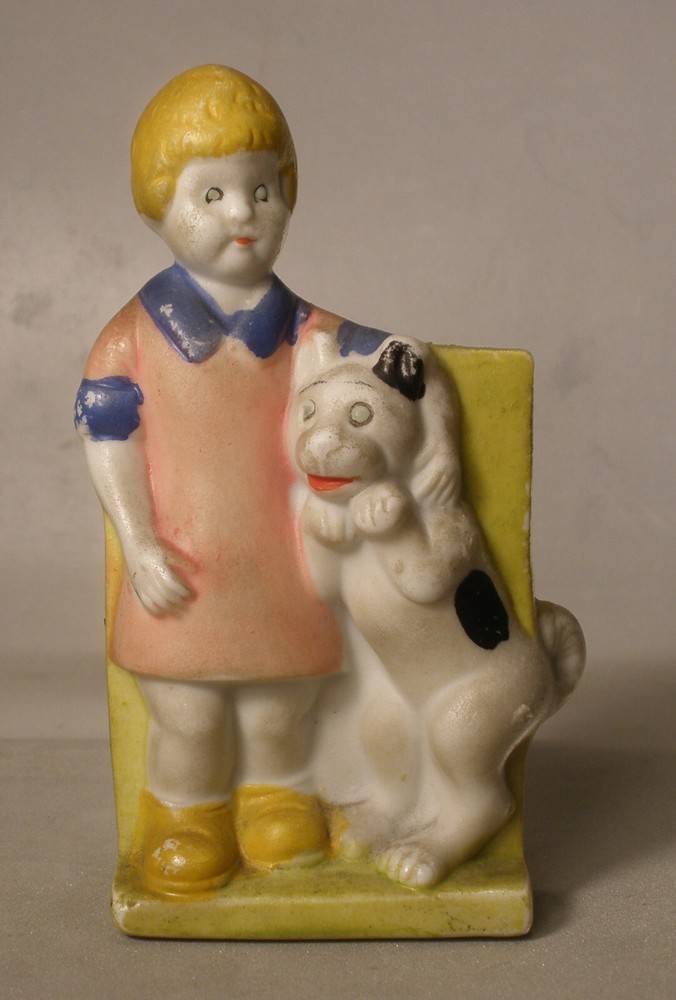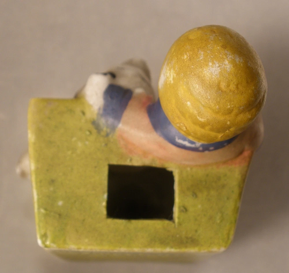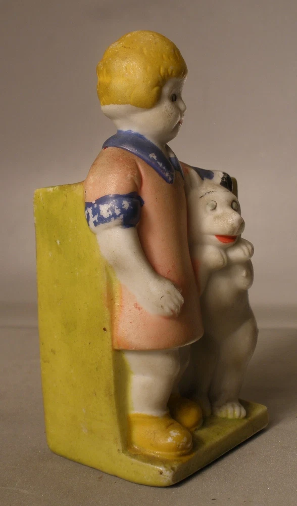 Orphan Annie and Sandy Porcelain Toothbrush Holder, 4 inches high, marked on bottom “Japan”, incised on back “Orphan Annie & Sandy, © F.A.S., S1565”, some soiling on the bisque, some wear to the paint, paint chipped along the lower edge on the back, hand painted details with some overlap, square cut into the bisque of the ledge behind Little Orphan Annie for holding the toothbrush, cute comic figurine. US shipping via USPS Ground Advantage . International shipments are via eBay International. Description is as accurate as possible. Any questions, please feel free to ask.