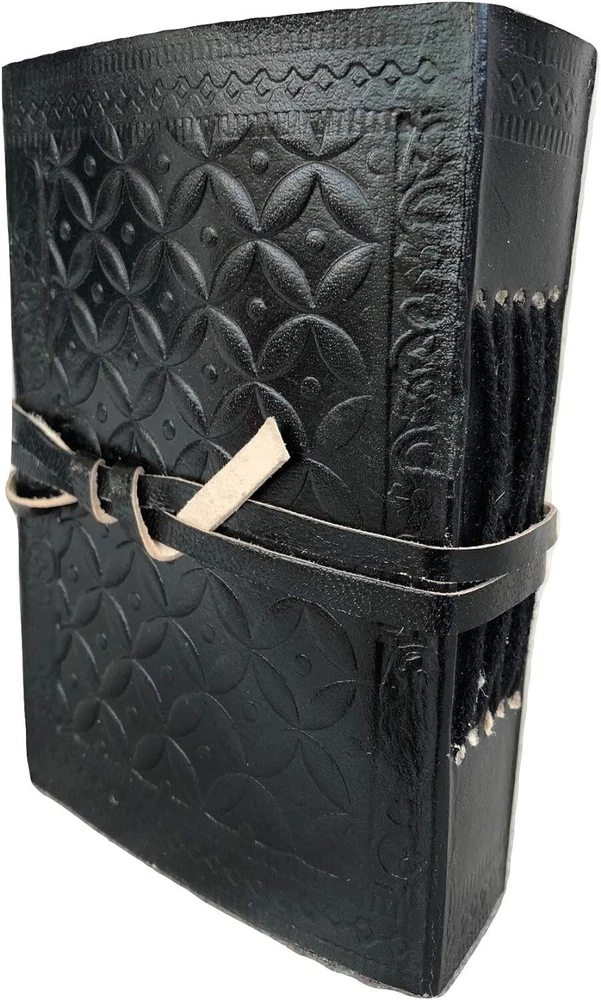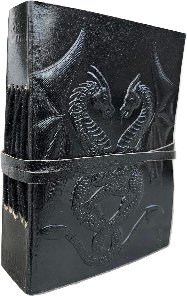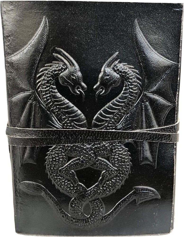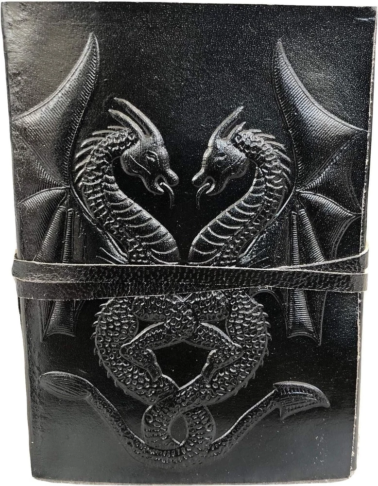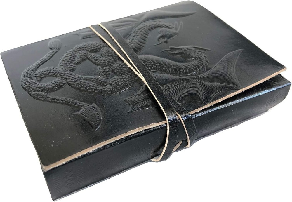 (PACK OF 2 WITH GIFT Size: 10" X 7" & 3.5" X 5" ) Handmade Vintage Leather Double Dragon Bound Journal Notebook Diary Sketchbook Travel Office Thought Blank Book Best Gift for Men & Women (Black) About this item CAREFULLY CRAFTED: This antique pocket leather notebook is meticulously crafted with fine details to present a magnificent journal. It has double dragon engraved on the top of it and beautiful flower pattern at the back. This leather-bound journal offers a soft touch outer surface as authentic leather is used in its making. USAGE: It is used as a detailed account of information, ideas, thoughts, daily agendas, travel itinerary etc. Academic journals promote active reading, personal journal provoke deep thinking. It motivates you when you are presented with so many elements in one single source. It is a method of personal organization, a daily record of financial transactions, a track record of events. VERSATALITY: It is a thoughtful gift as travel journal, artist sketchbook, composition book, writing pad, literary gift, sketchbook, personal diary and more, on occasions like birthday, anniversary, wedding, promotion party, retirement party, graduation, Christmas, Easter, Thanksgiving, New year, Valentine’s day, Mother’s day, Father’s day etc. MACHINE PAPER: It comes with superior quality white paper prepared by machines. Experience a smudge free and comfortable writing and painting with calligraphy pen, fountain pen, brush pen, ball pen, acrylic colours, watercolors etc. The pages are leather bound and smooth. This long-lasting vintage journal is beautifully and firmly tied-up in criss-cross pattern. DIMENSIONS: It is 5 inches wide, 3.5 inches tall and about 1 inche thick with 15 inches long leather wraparound tie, ideal size to carry from one place to another and comfortably fits inside pockets, purses, and bags. It consists of 120 pages single side and 240 on both sides.